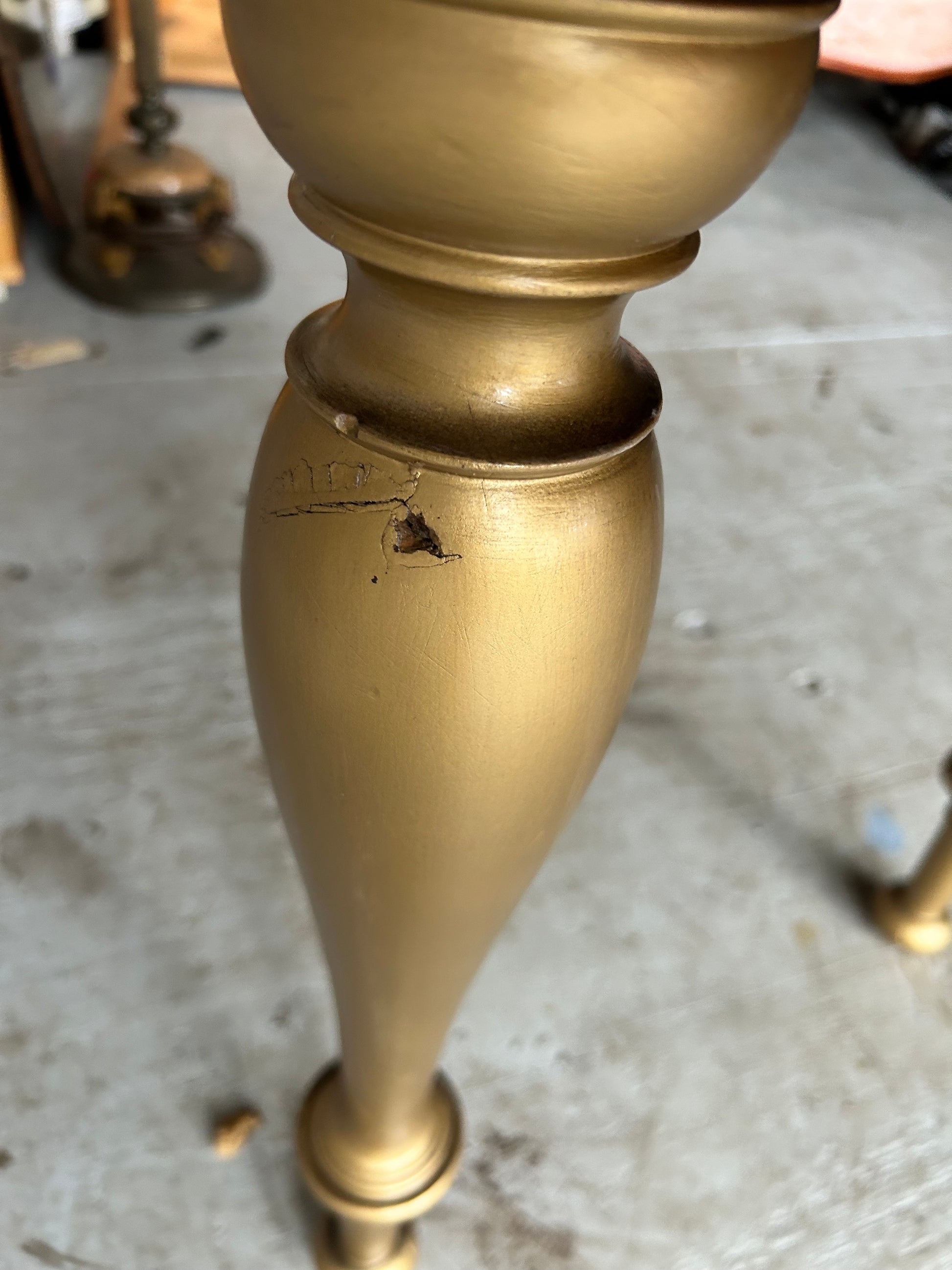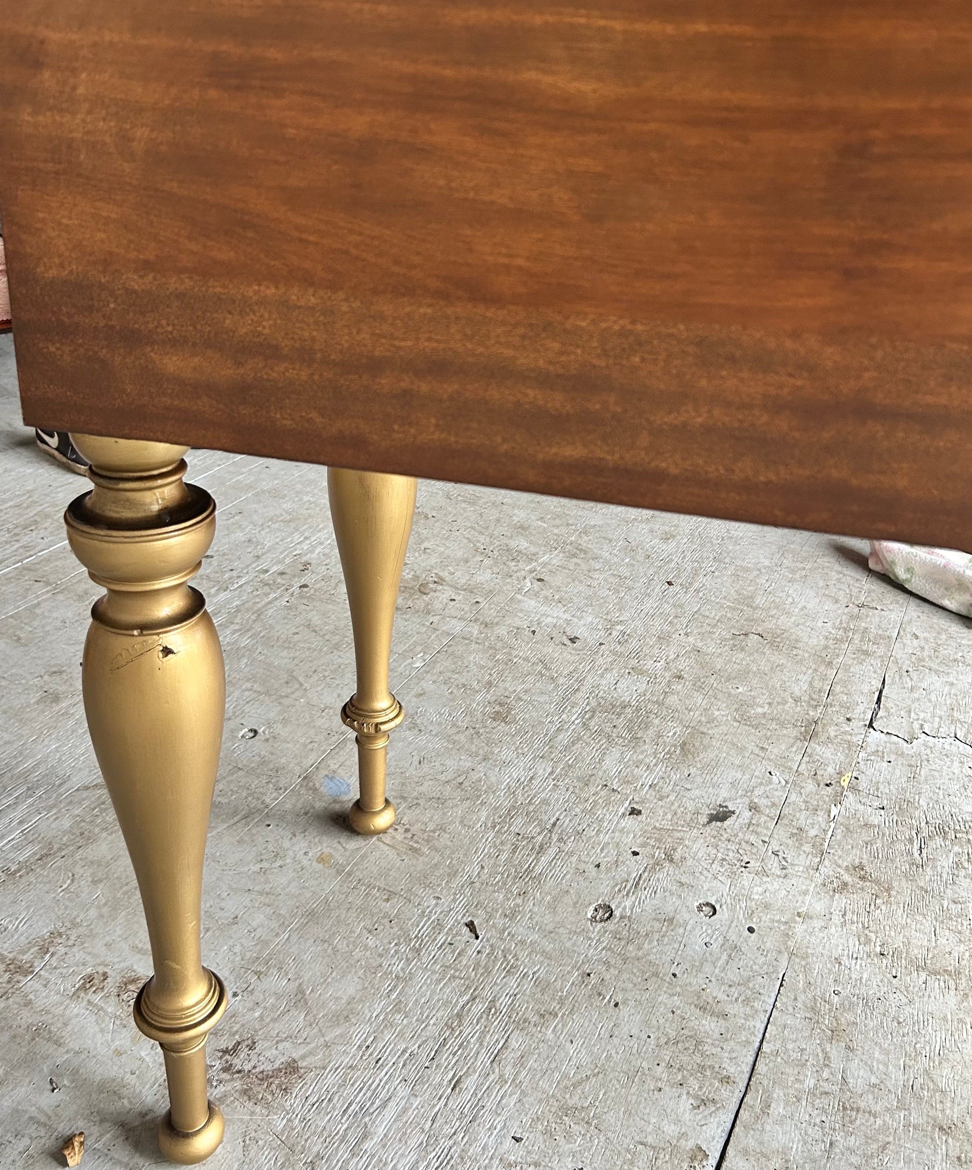 Antique wood desk. Dark stained and gold. Top folds down so that it's just a table, open it's a full desk. The bottom slides out to make the table larger. Has a drawer under plus lots of shelves. Minor wear from age (see photos).