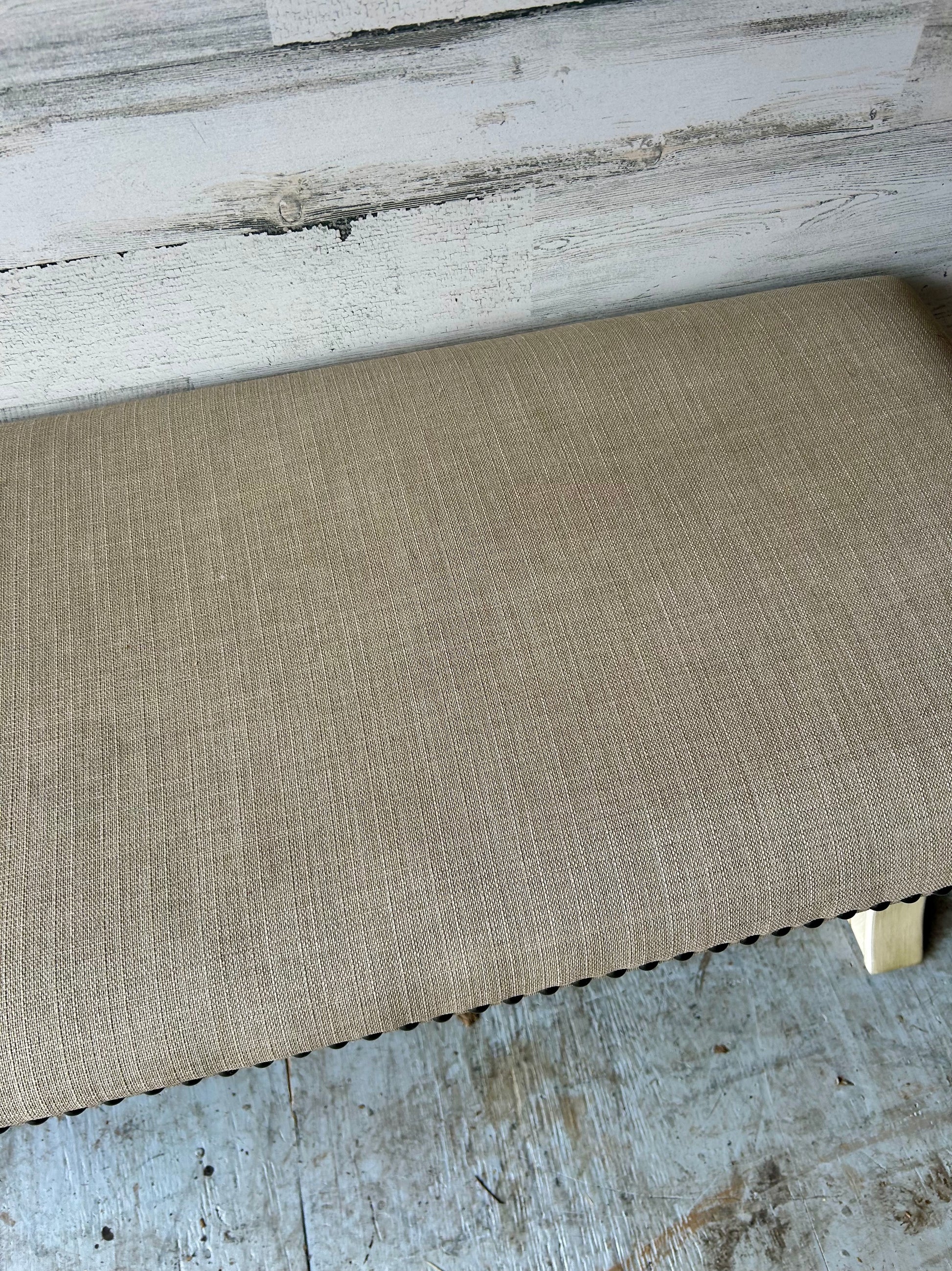 Wood bench with upholstered top. Antique white wood base. Top is a white upholstery with studs around the trim. Minor wear.