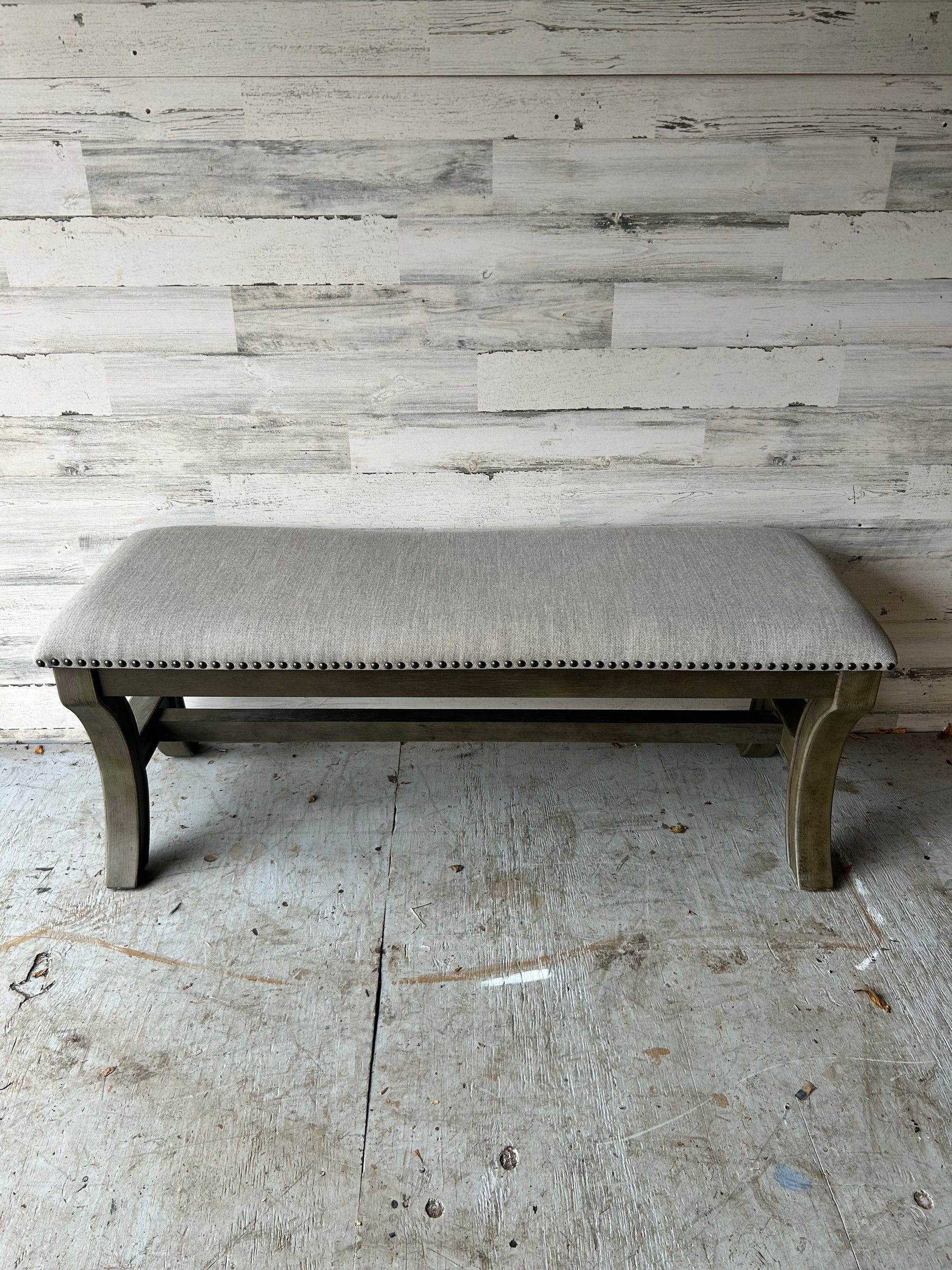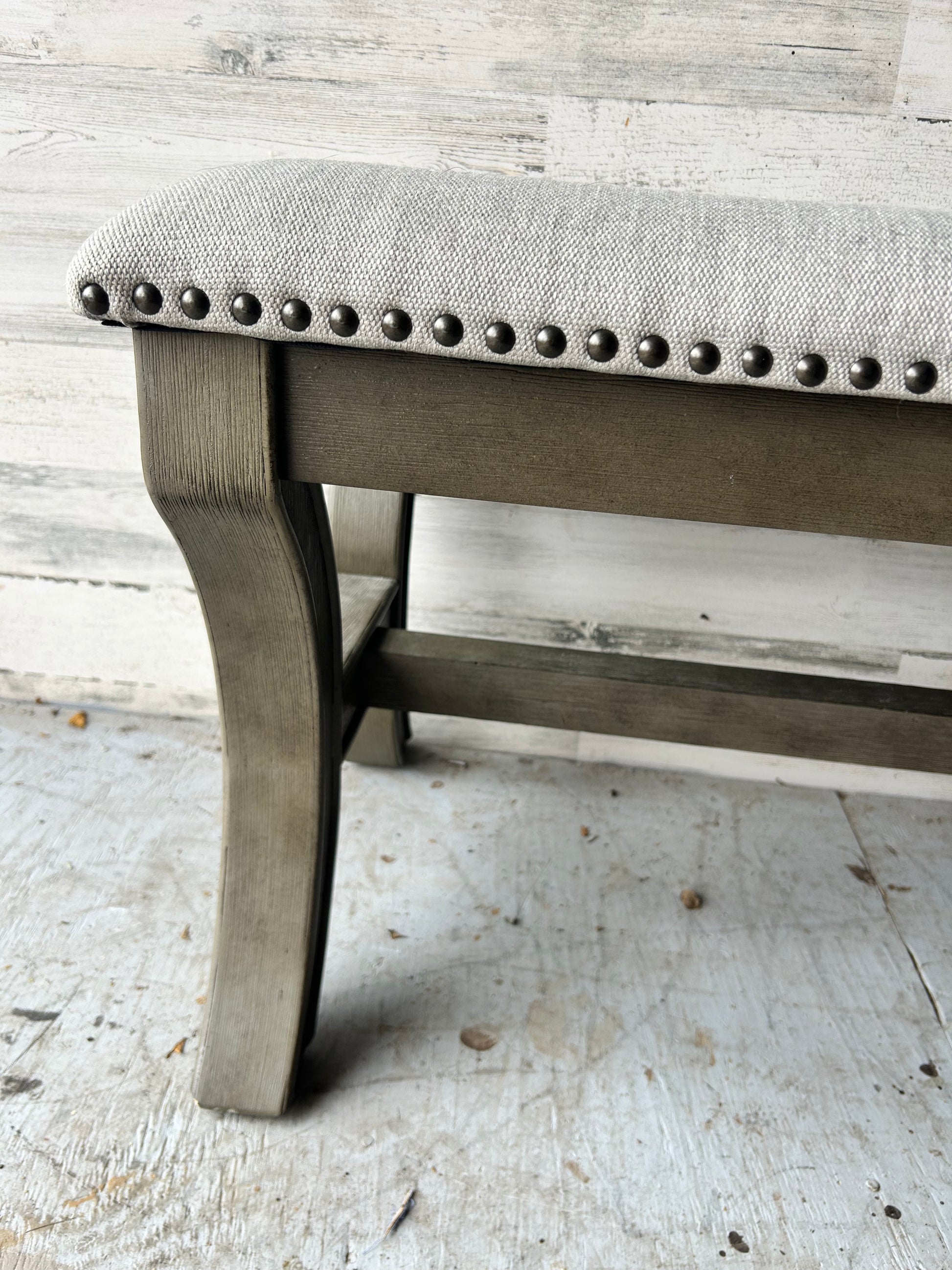 Gray bench, wood base with a feather gray upholstery. Dark brassy studs around the trim. Minor wear.