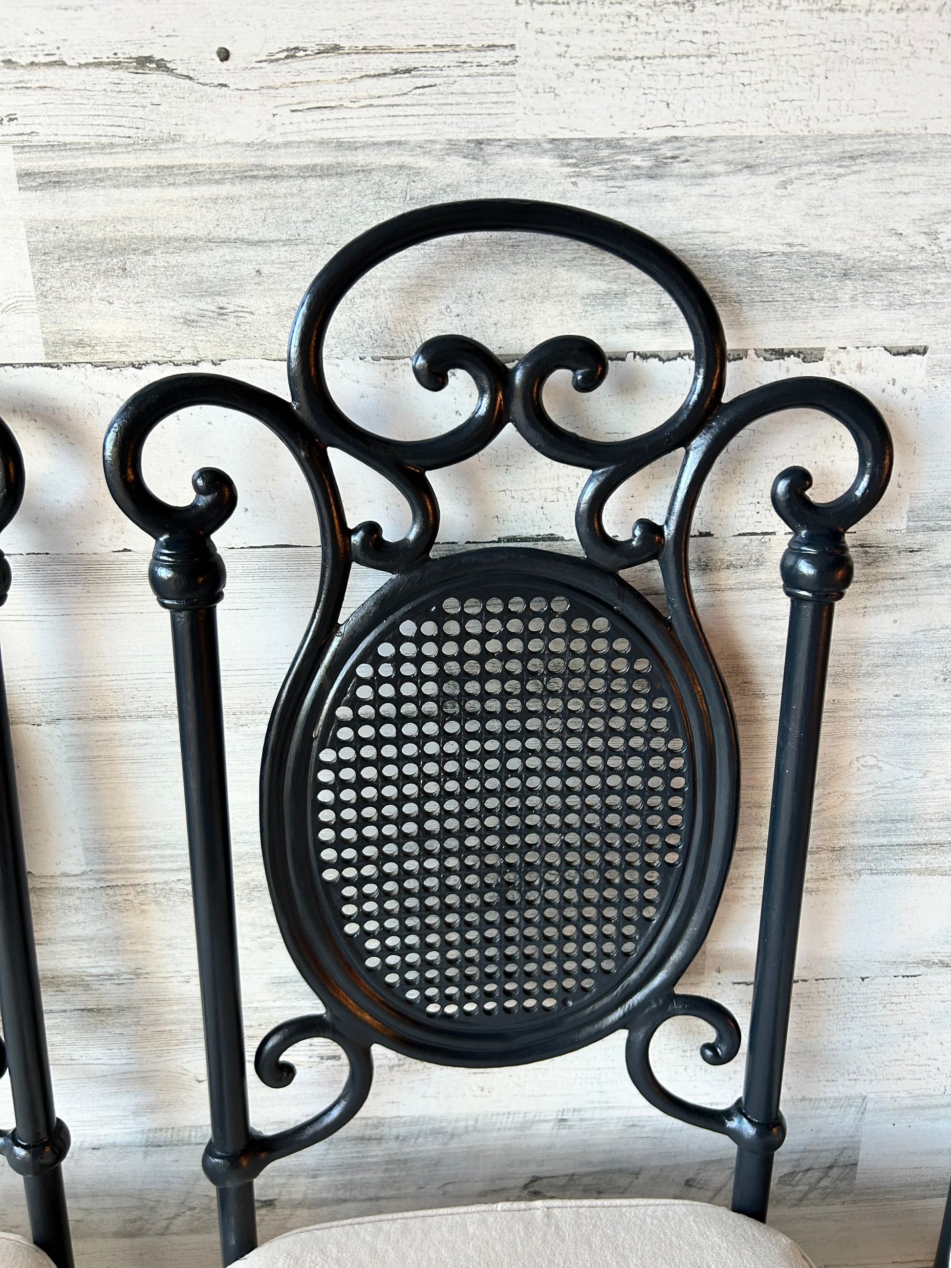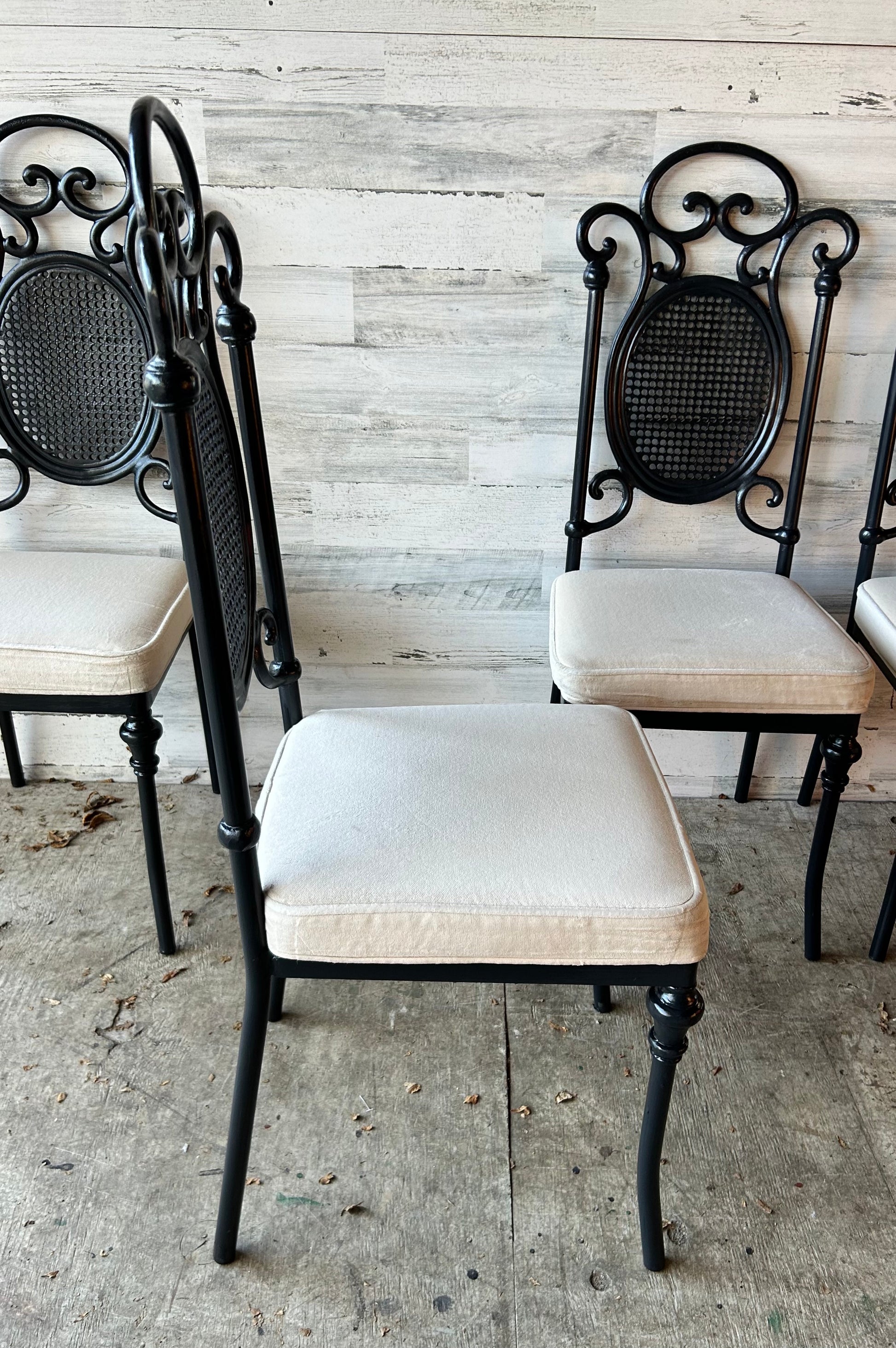 Vintage dining/kitchen chairs. Set of four. Black metal with curved detail back. Seats are a taupe crushed velvet. Minor wear from age.