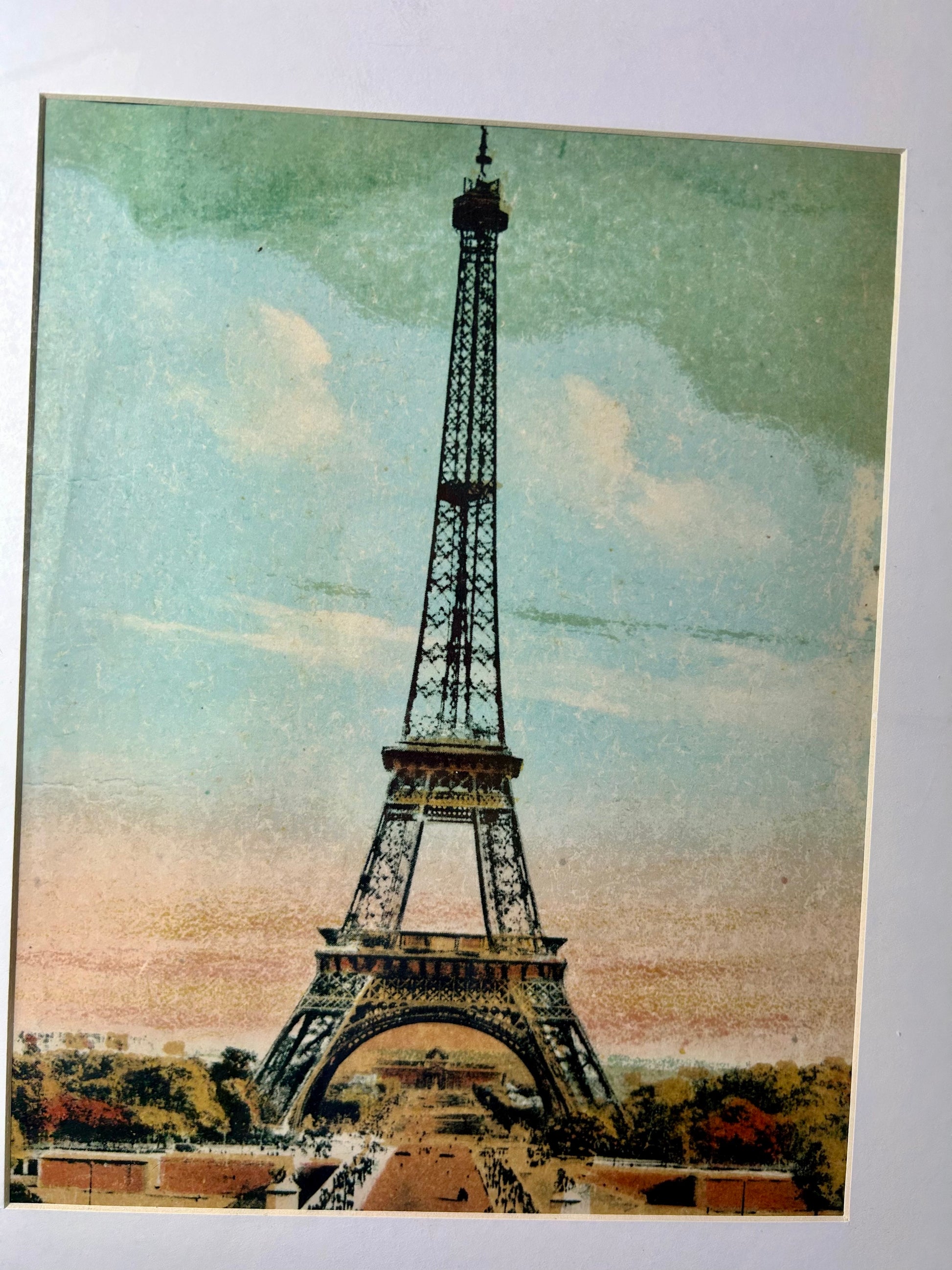 Vintage print of the eiffel tower in France. White matting with a gold, wooden frame.