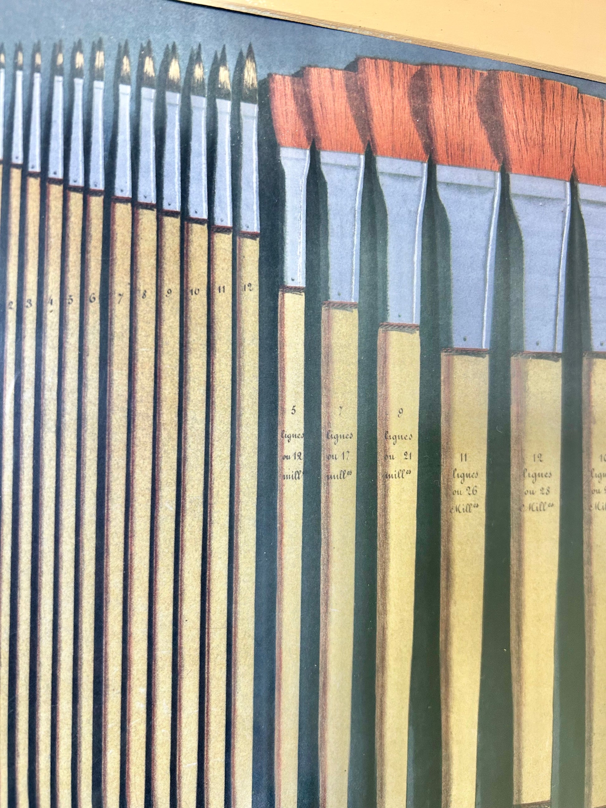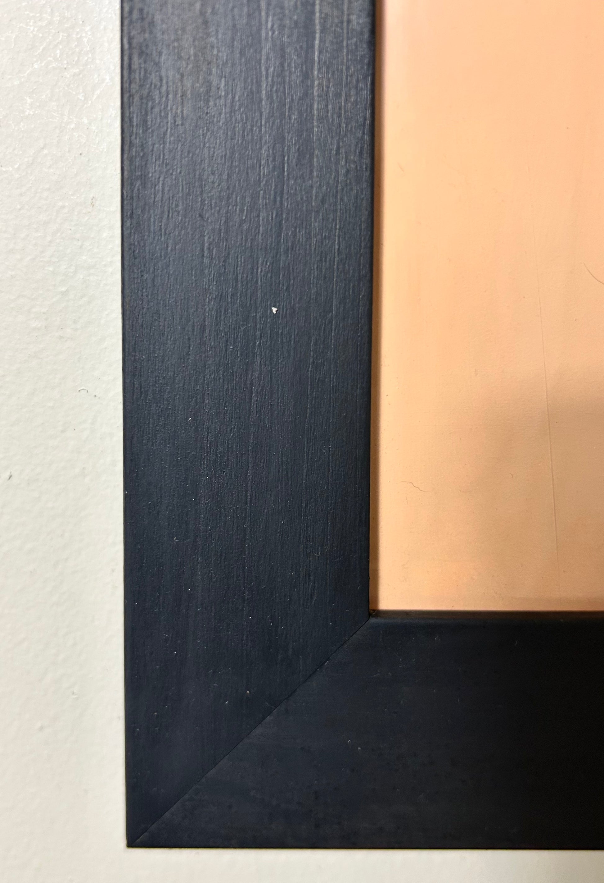 Vintage black, wood frame with a pale matting. Framing an abstract artwork featuring paintbrushes. Minor wear from age.