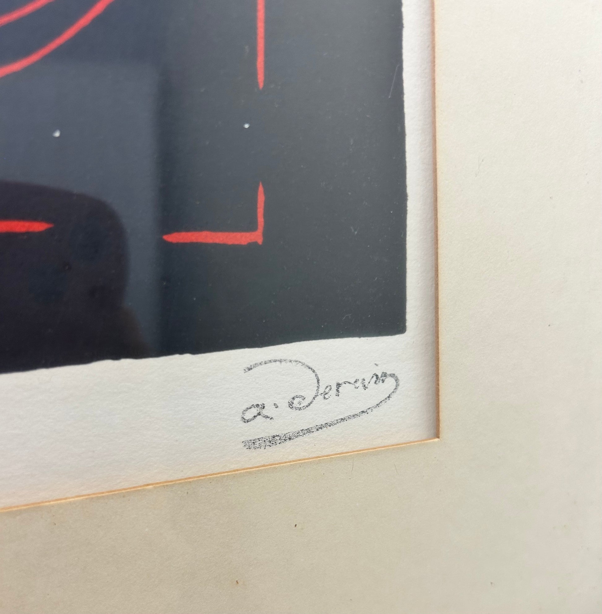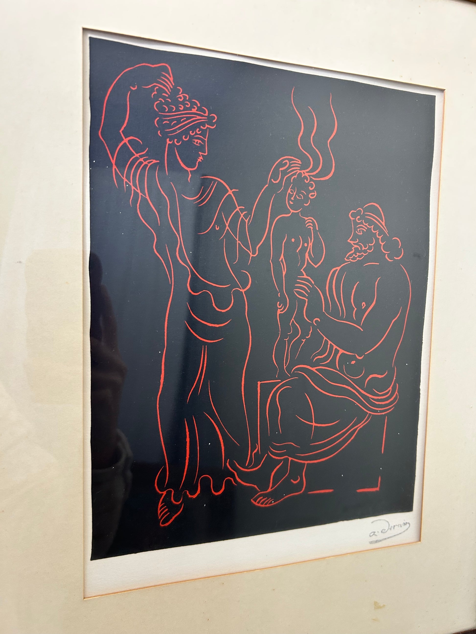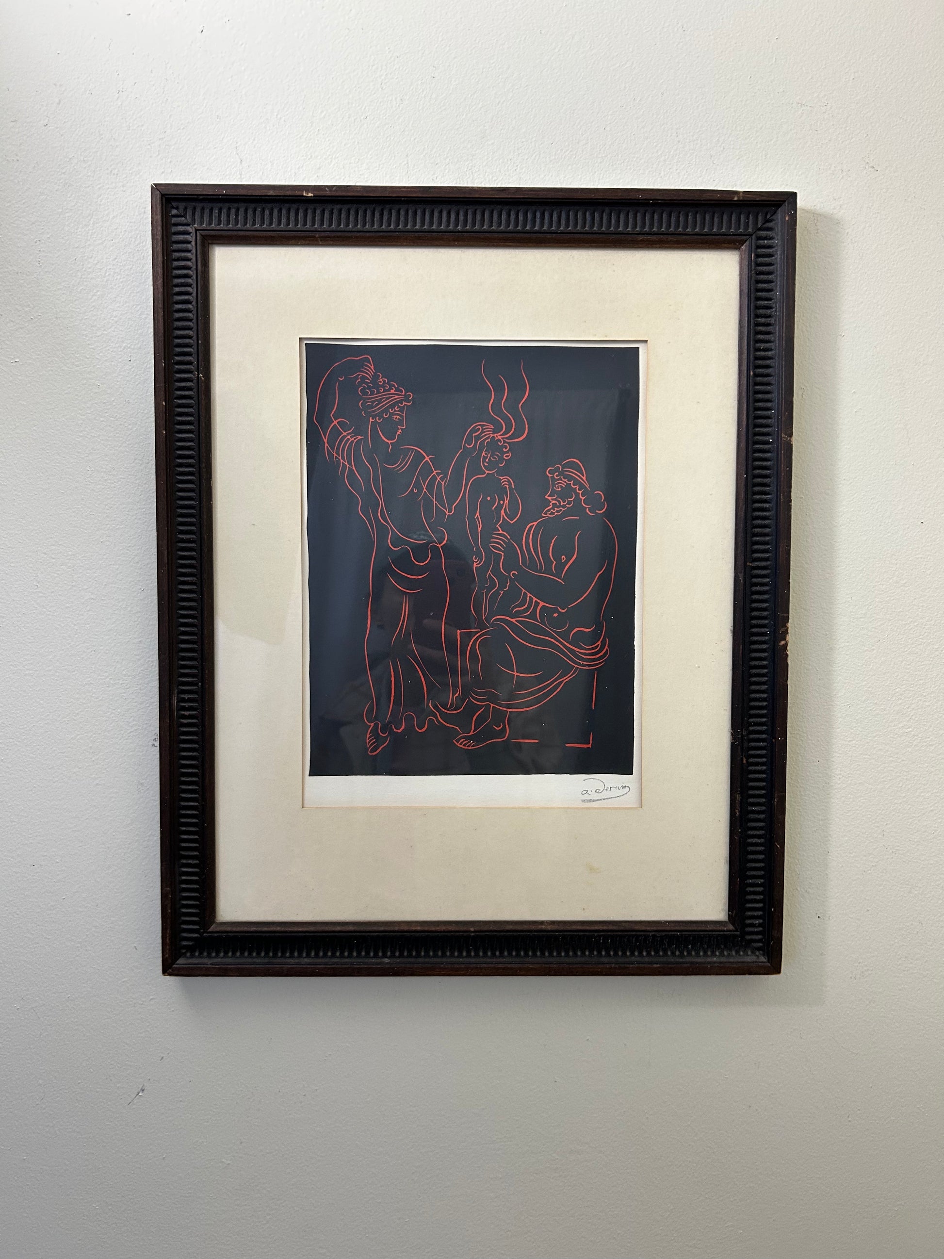 Vintage dark wood frame. Off white matting. Hand signed linocut artwork in black and red. By artist Andre Derain. Minor wear from age.