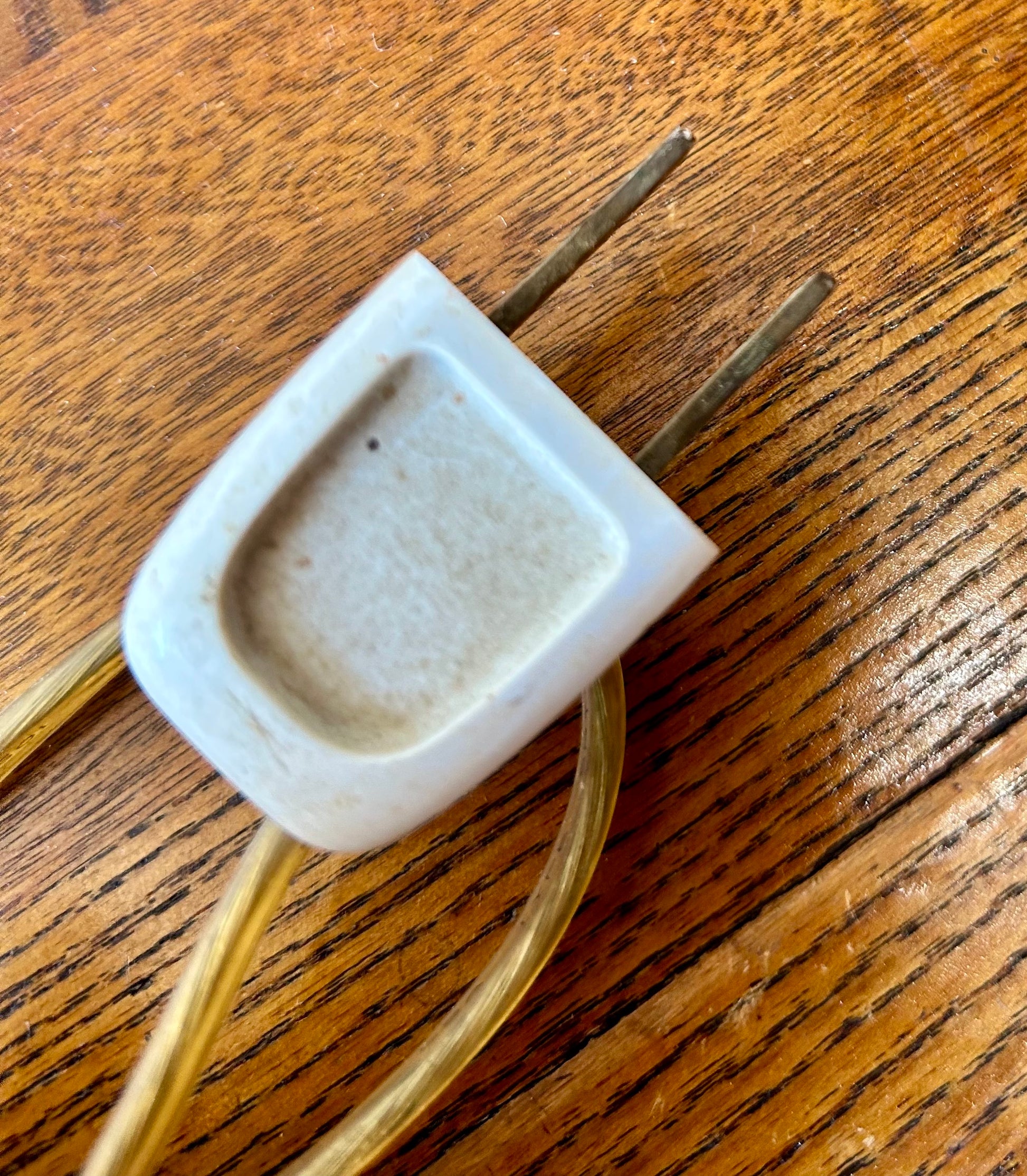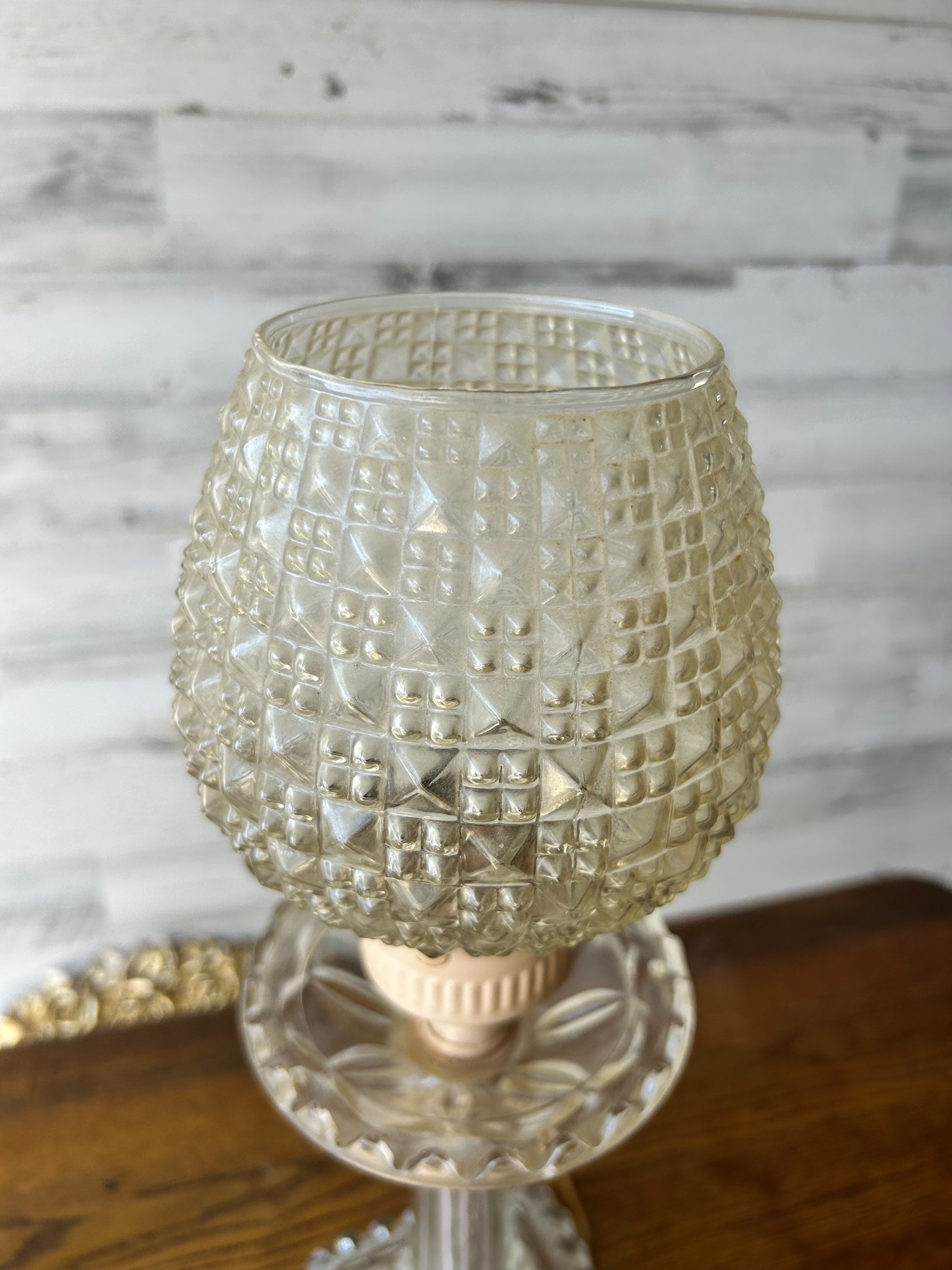 Vintage glass lamps with a metal middle. The base has a hint of pink on the inside. The switch is a brass turn key. Minor wear from age.