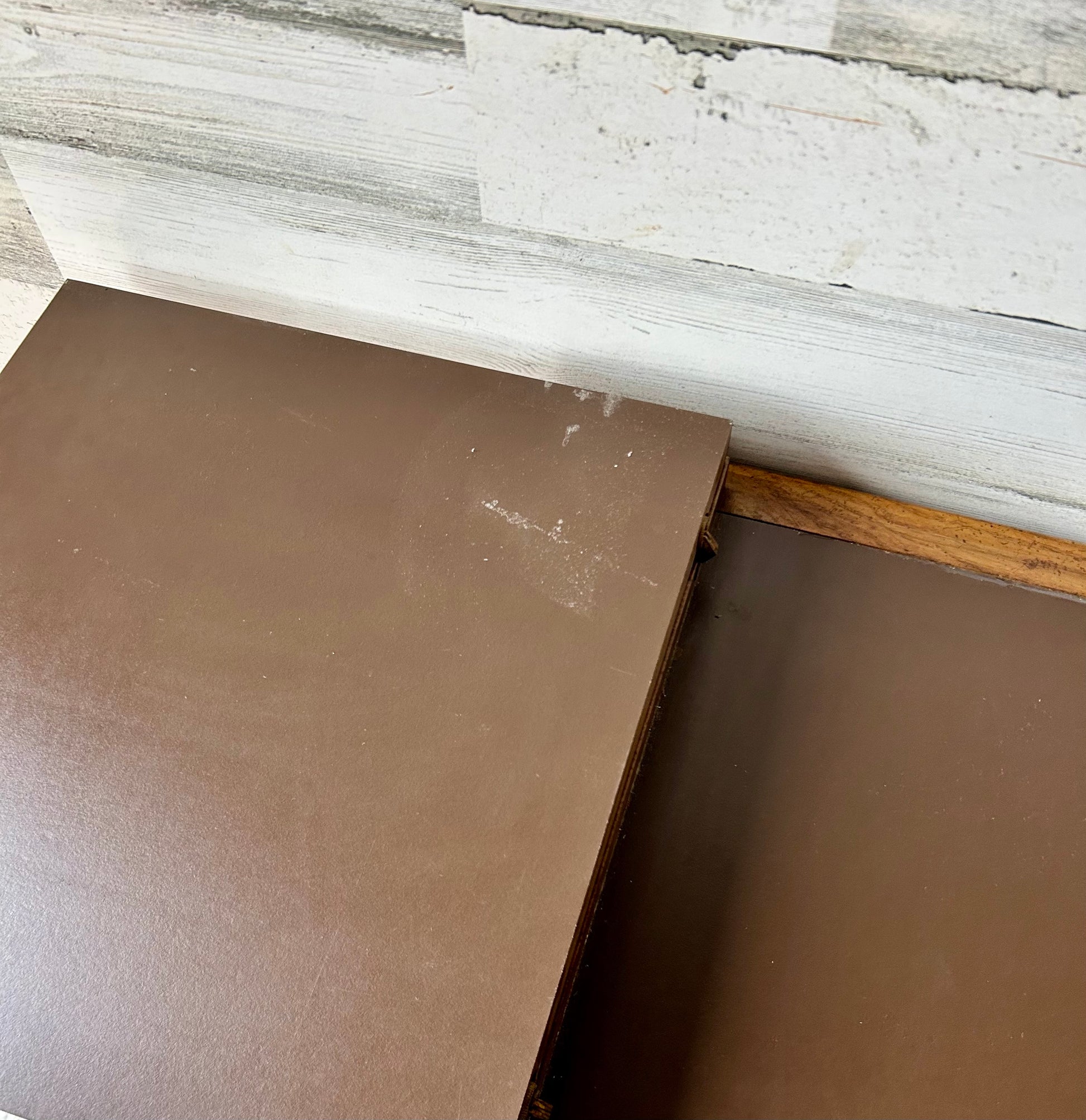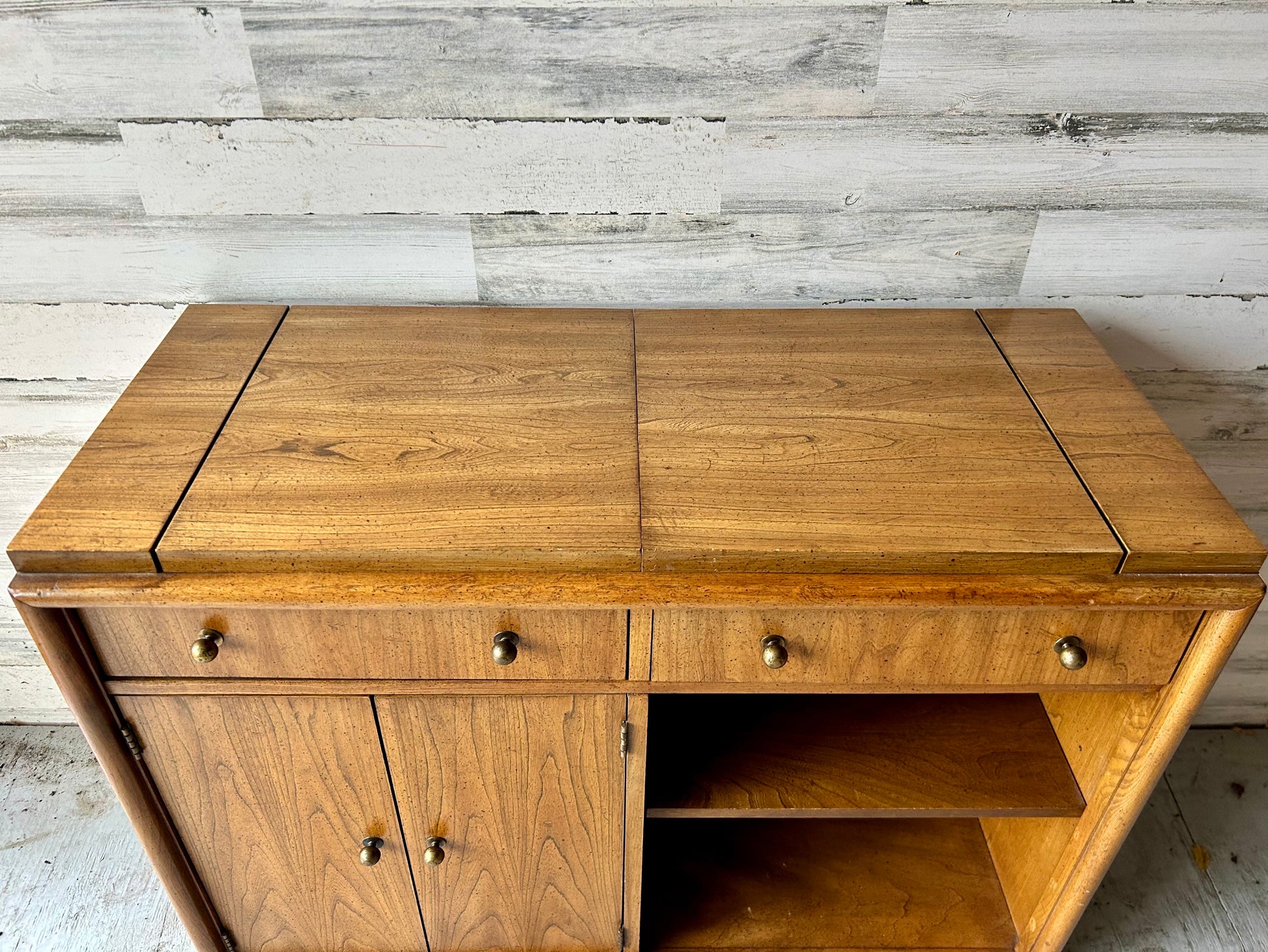 Original vintage mid century modern bar/buffet cabinet. Solid wood with original brass handles. The top folds out to make a larger serving top. Two drawers, Two shelves, a cabinet with two shelves. The cabinet is finished in the back, so it can be pulled out and used from either side. On metal wheels. Small minor stain on the inside top (see picture).