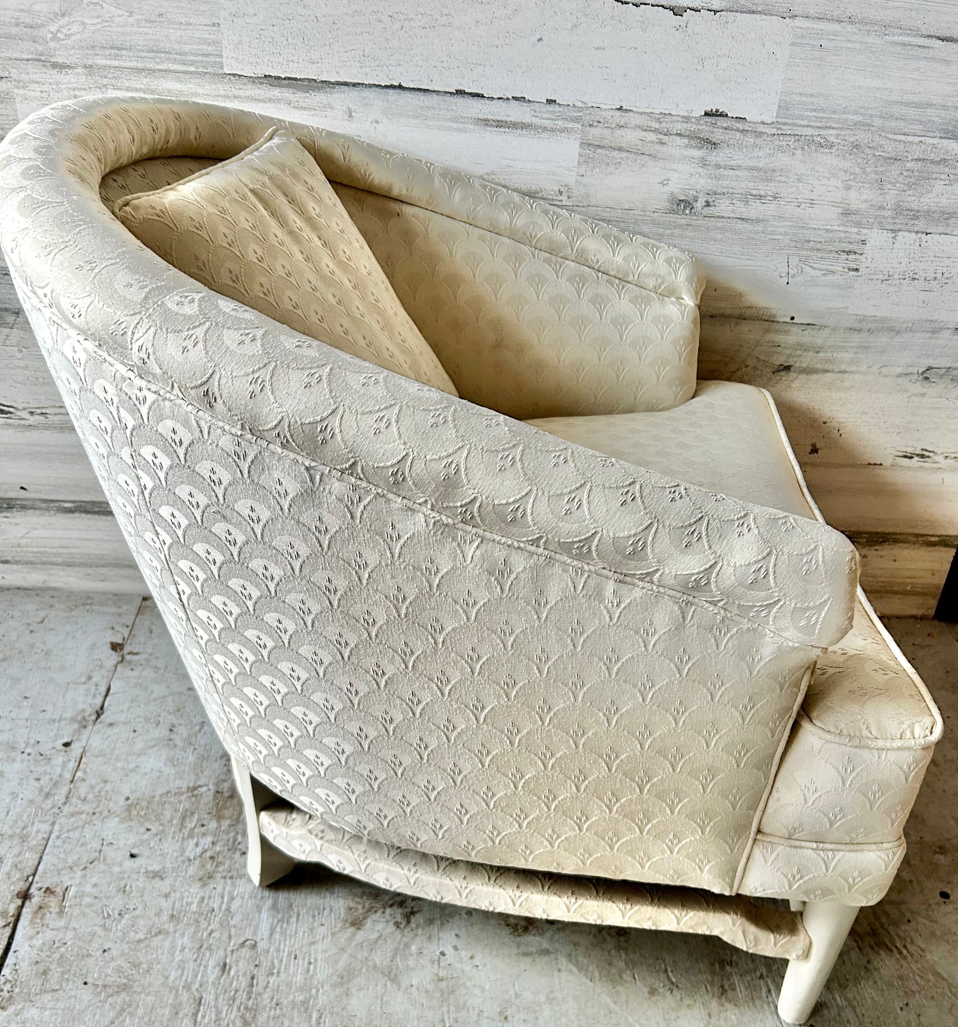 Vintage barrel chair. Creamy white, original upholstery with matching pillows. Tuft button arms and wood legs. Minor wear from age.