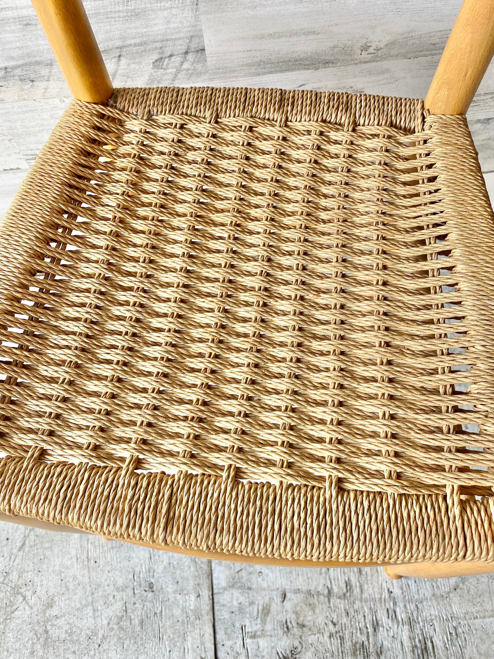 Solid wood construction, tapered legs, woven rope seat, sleek sculptural form, Made in Italy. Minor wear.