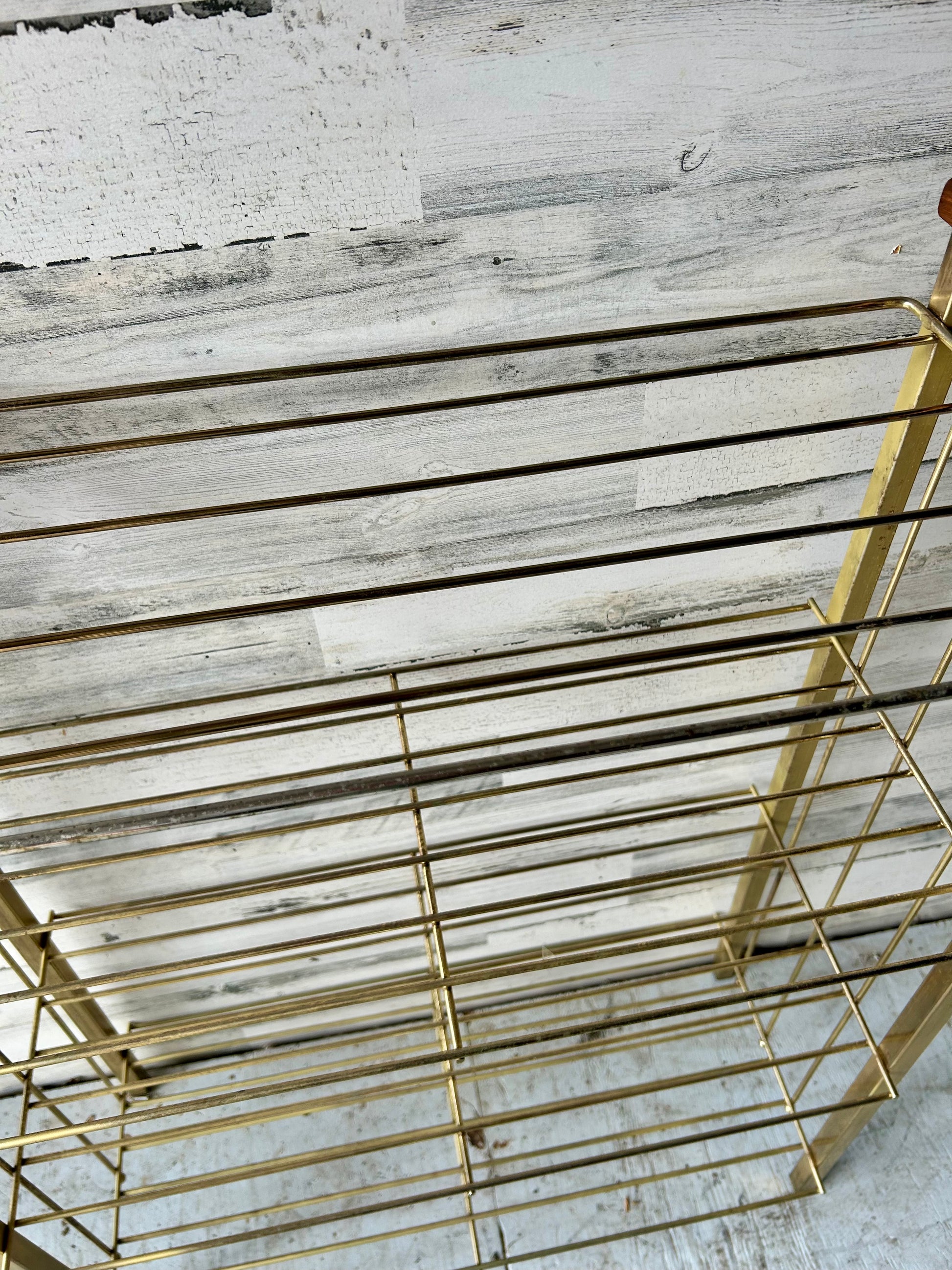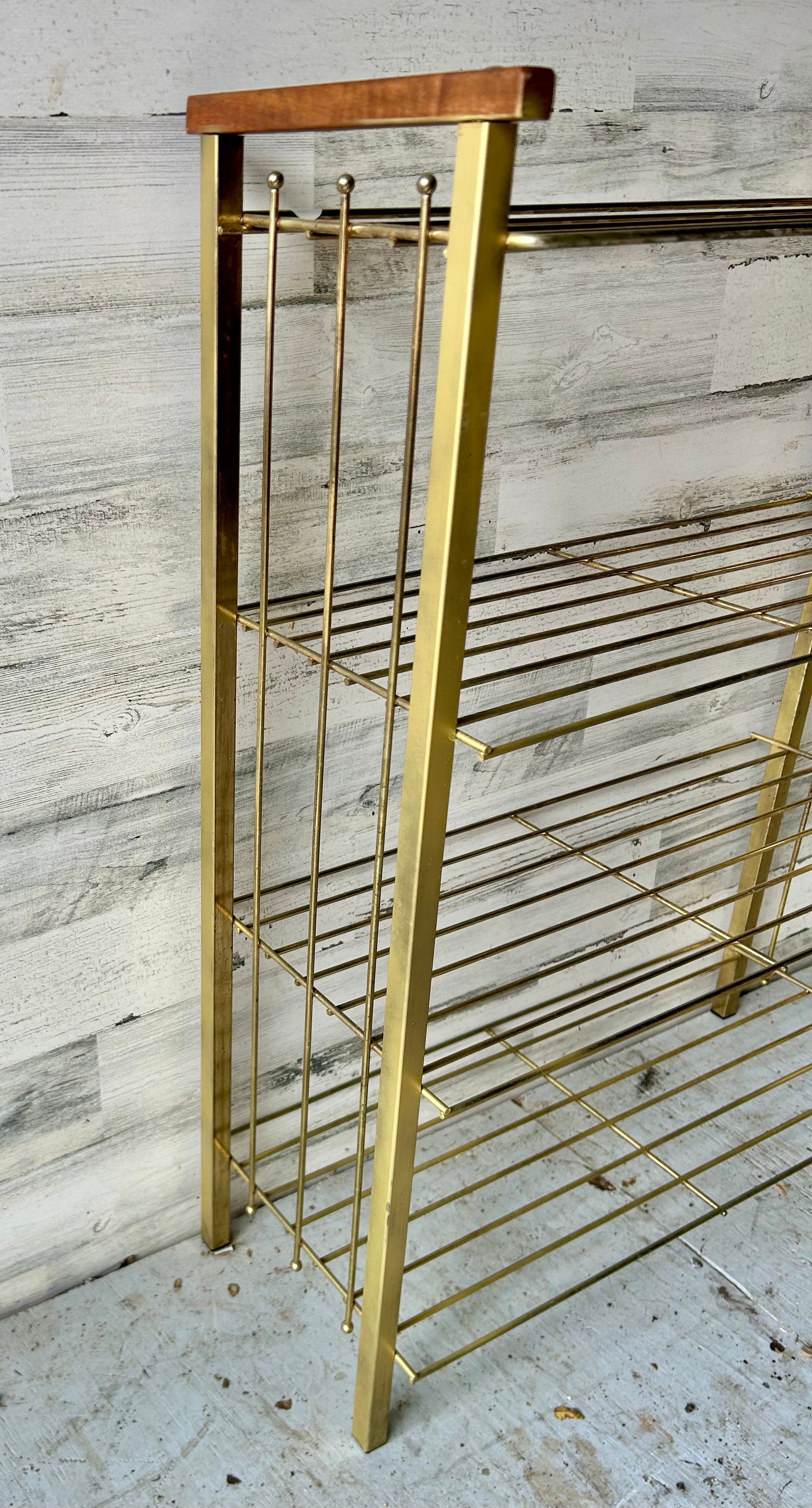 Vintage Mid Century Modern metal and teak shelf. Four levels, gold metal. The top handles are a dark wood teak. Minor wear from age.