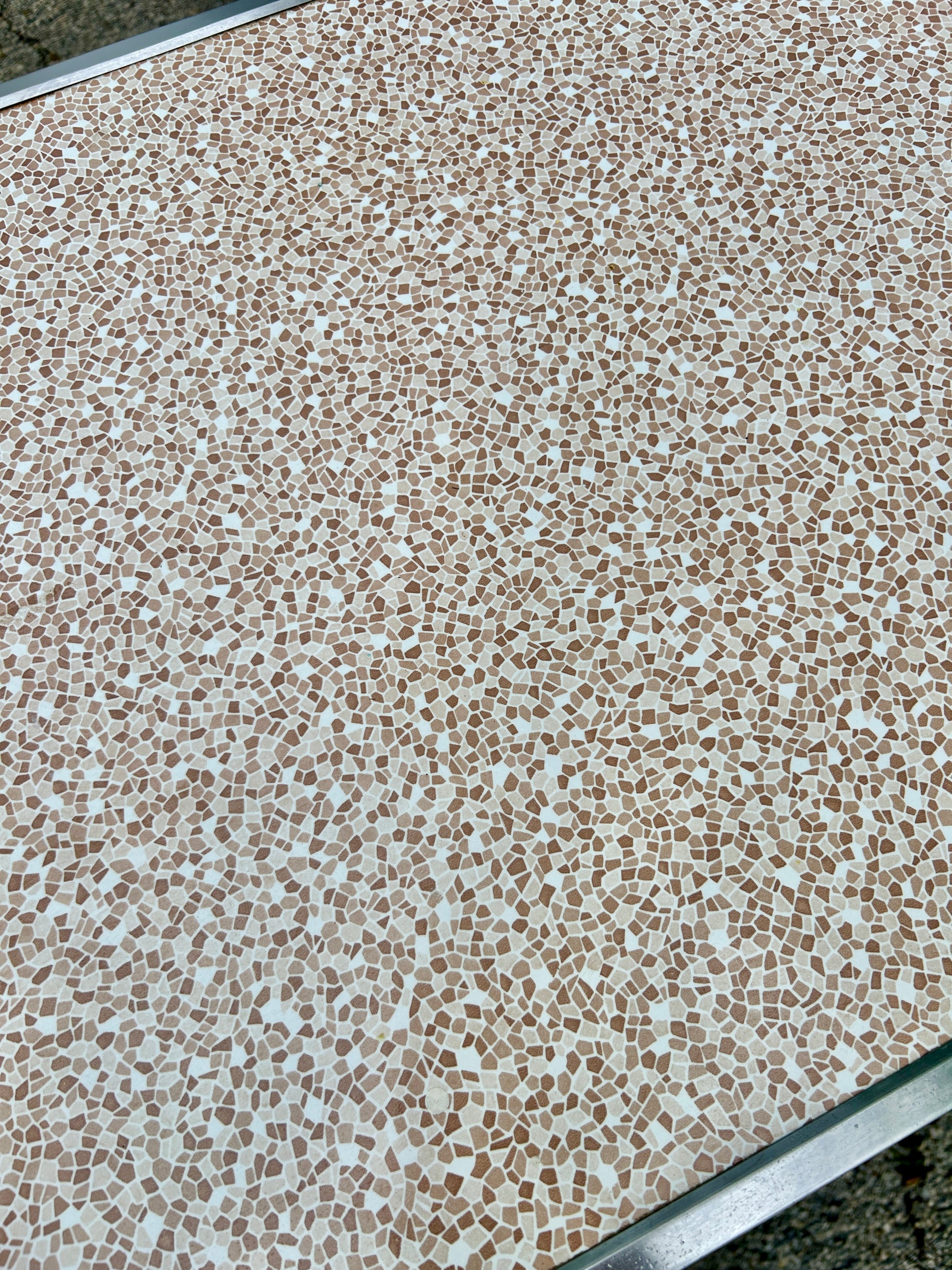 Vintage mid century modern table. Black metal hairpin legs, formica table top with a chrome border. Minor wear from age.