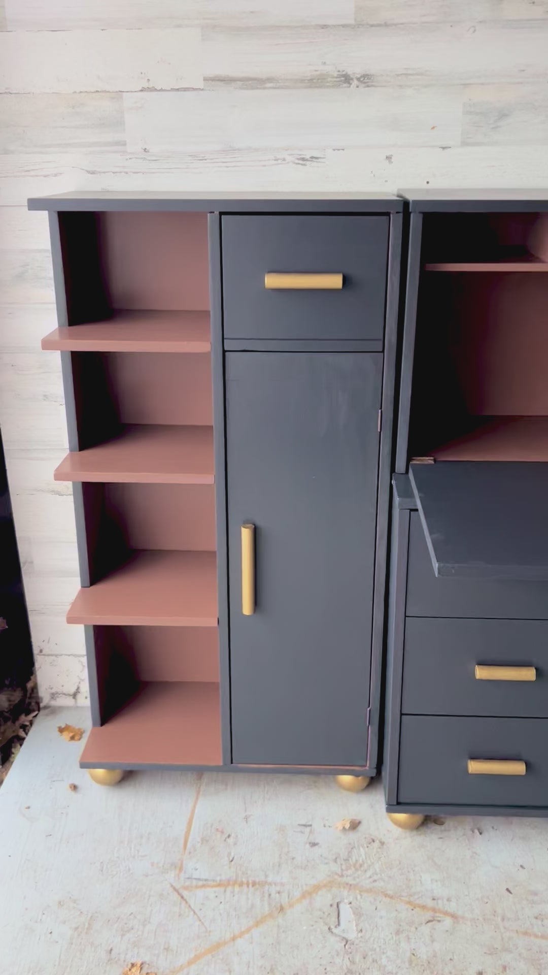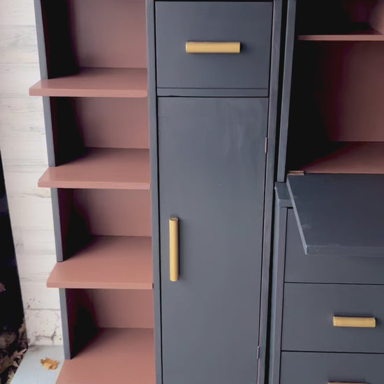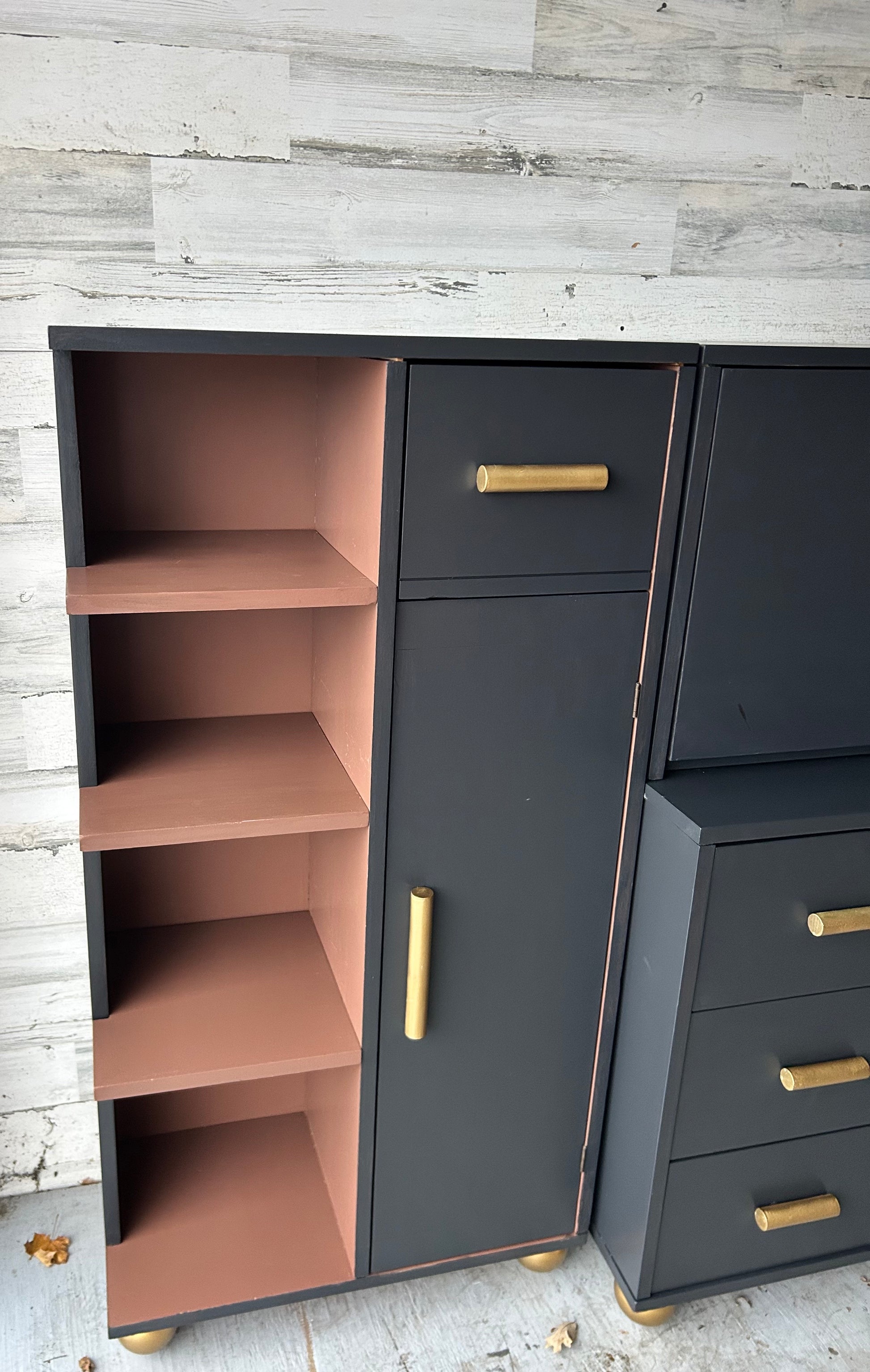 Vintage, Mid Century Modern, wood unit. Black with a leather brown colored accent. Gold wood handles and feet. Comes in four pieces. The cabinet with shelves on either side, the middle has a low three drawer dresser, and the top is a desk cabinet. Can be moved in four separate pieces, there is a screw to keep the desk cabinet attached to the dresser after assembled. Minor wear here and there from age.