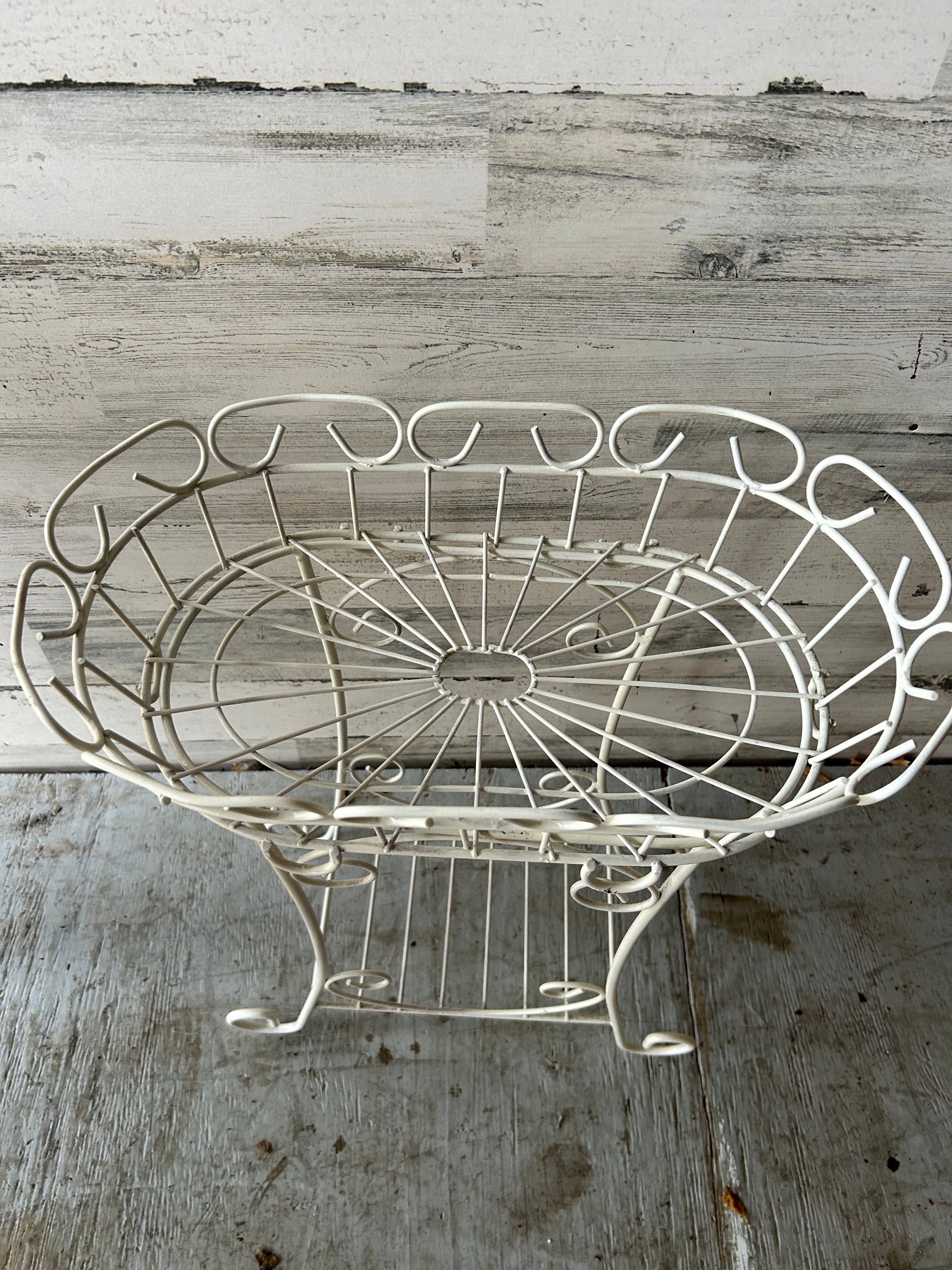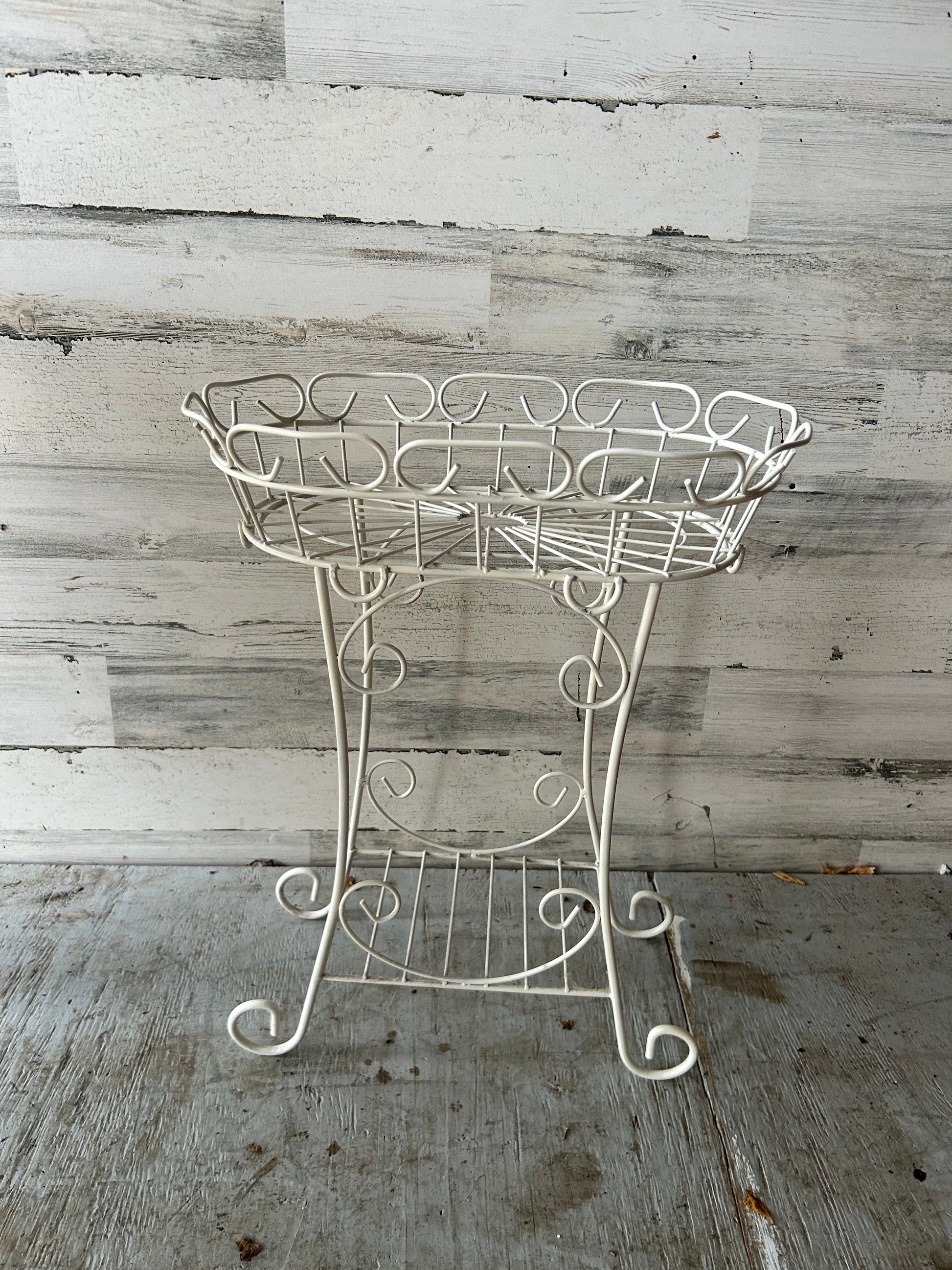 Vintage metal planter. White, with a basket and a shelf. The top planter comes off and can be used separately. Minor wear from age.