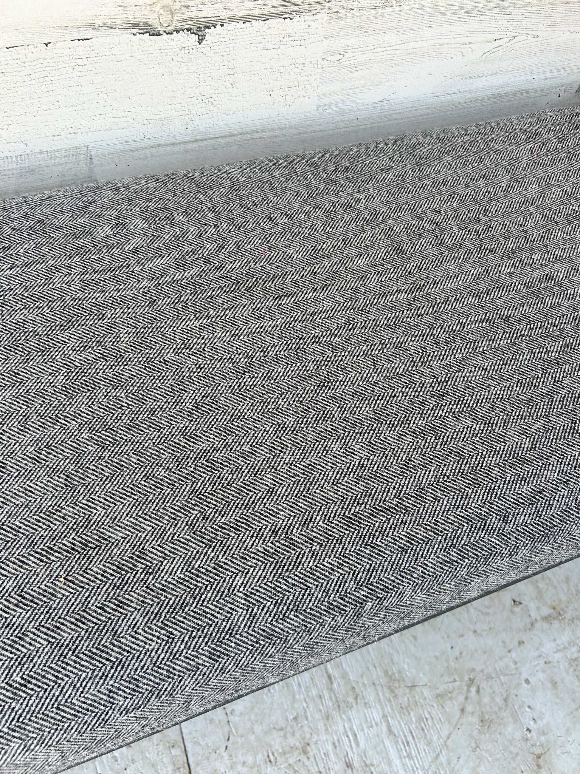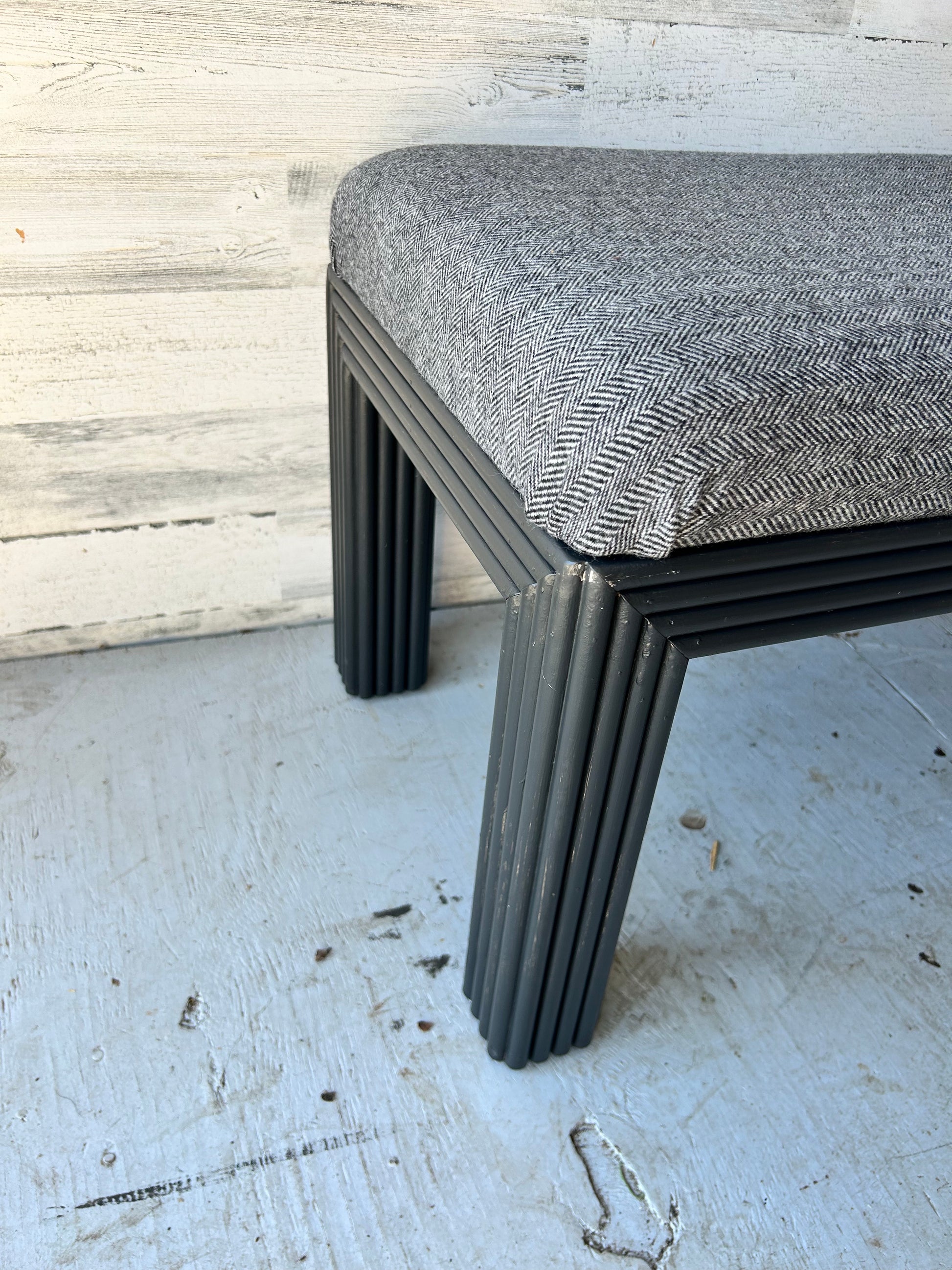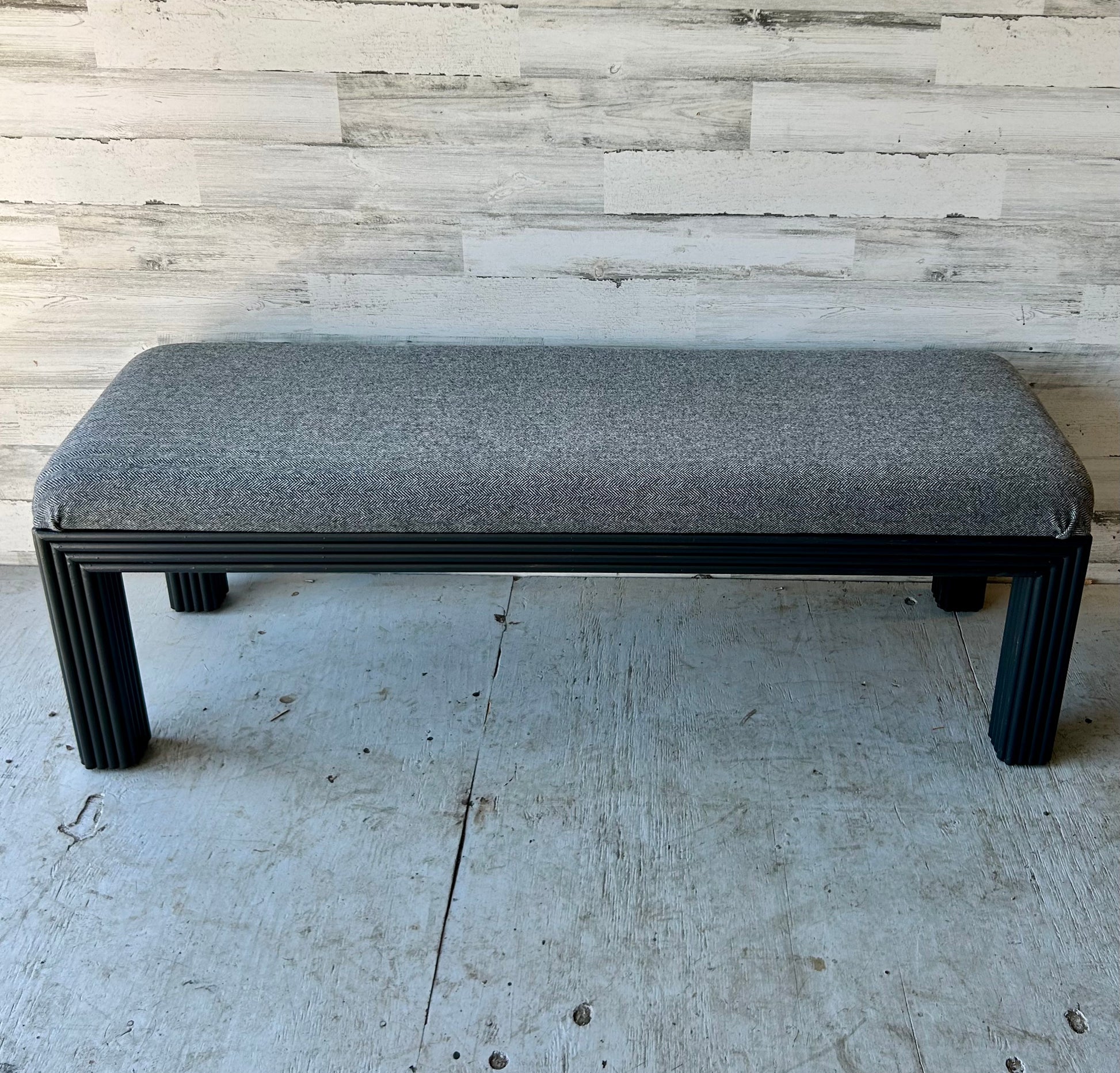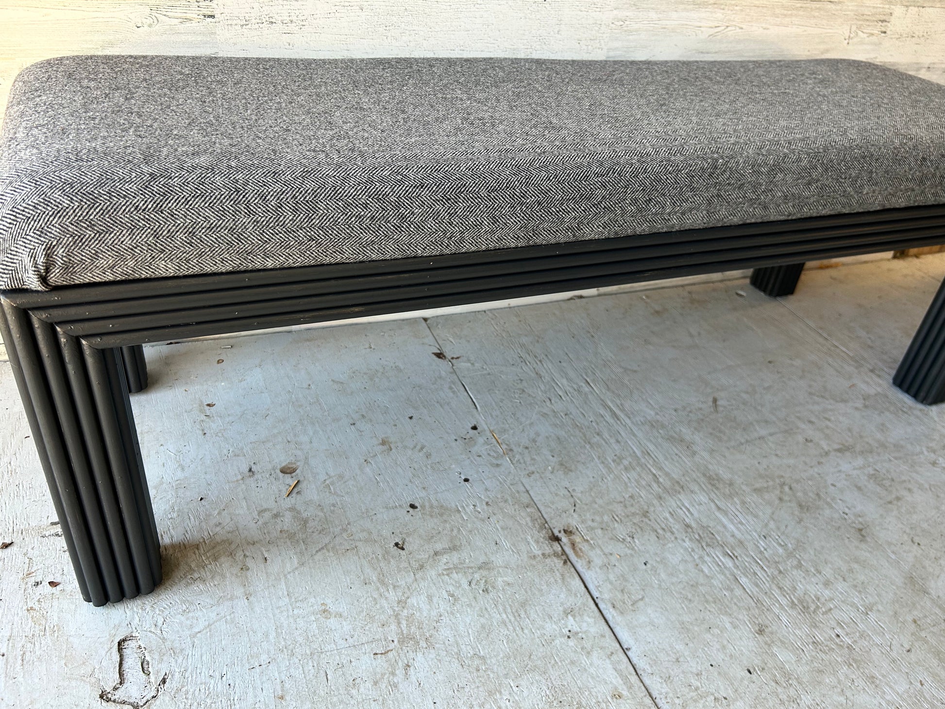 Vintage black post modern bench. Black base with a pleated design. The cushion is black and white herringbone. Recently reupholstered. Minor wear from age.