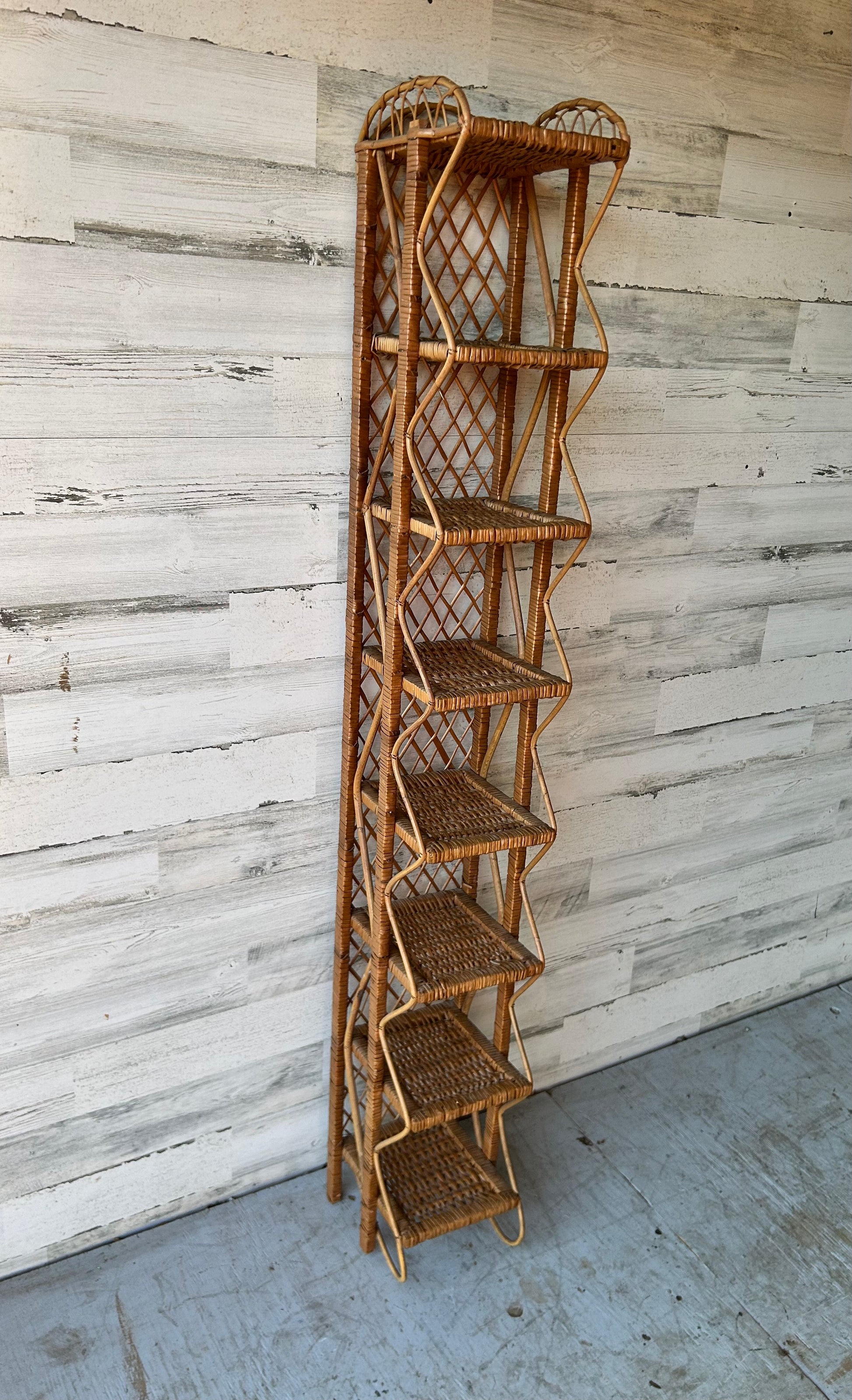 Vintage rattan tall shelf. 8 shelves for plants. Stands up on it's own, but needs to be secured to the wall if you are putting heavy items on it. Minor wear here and there from age.