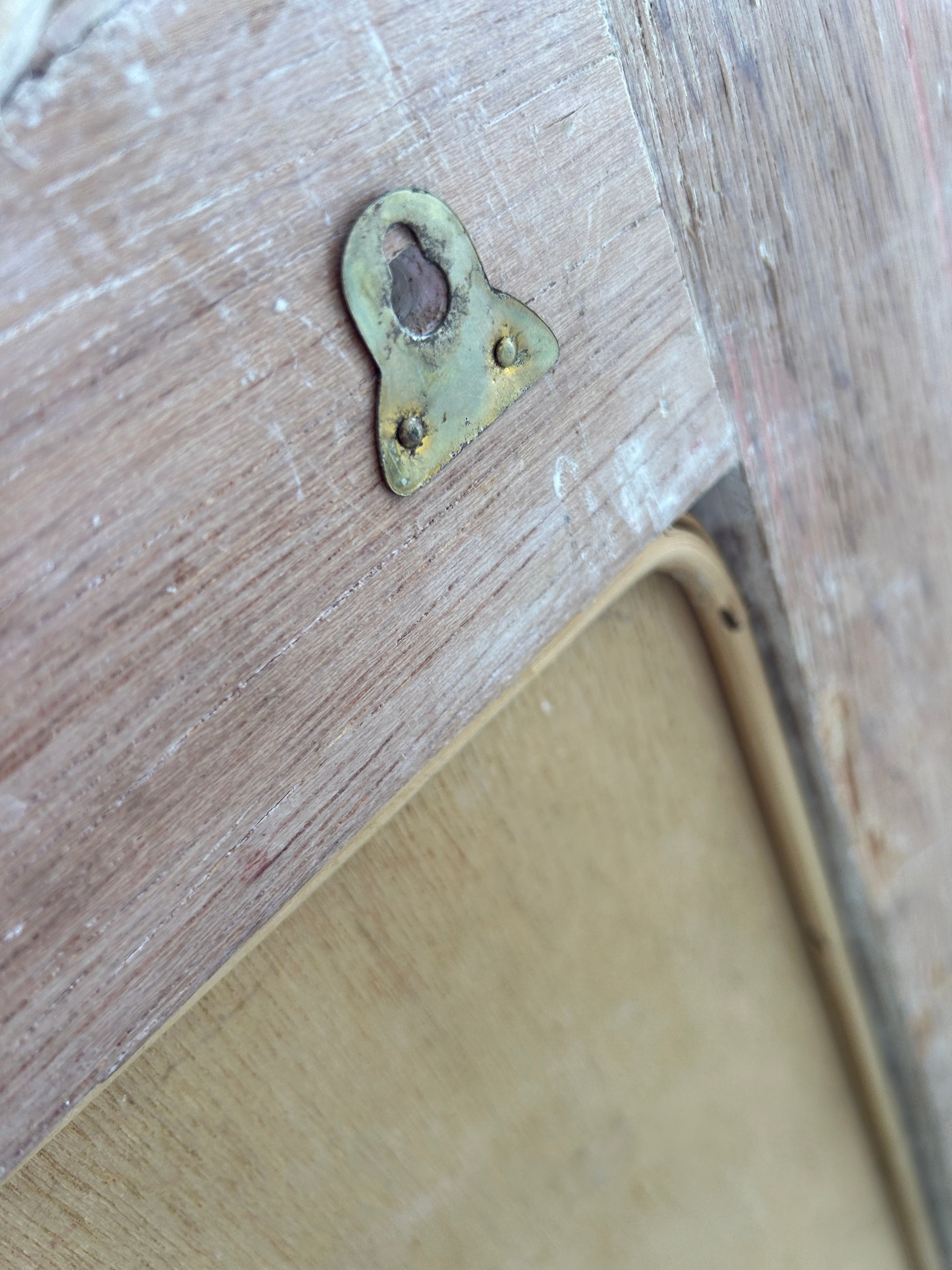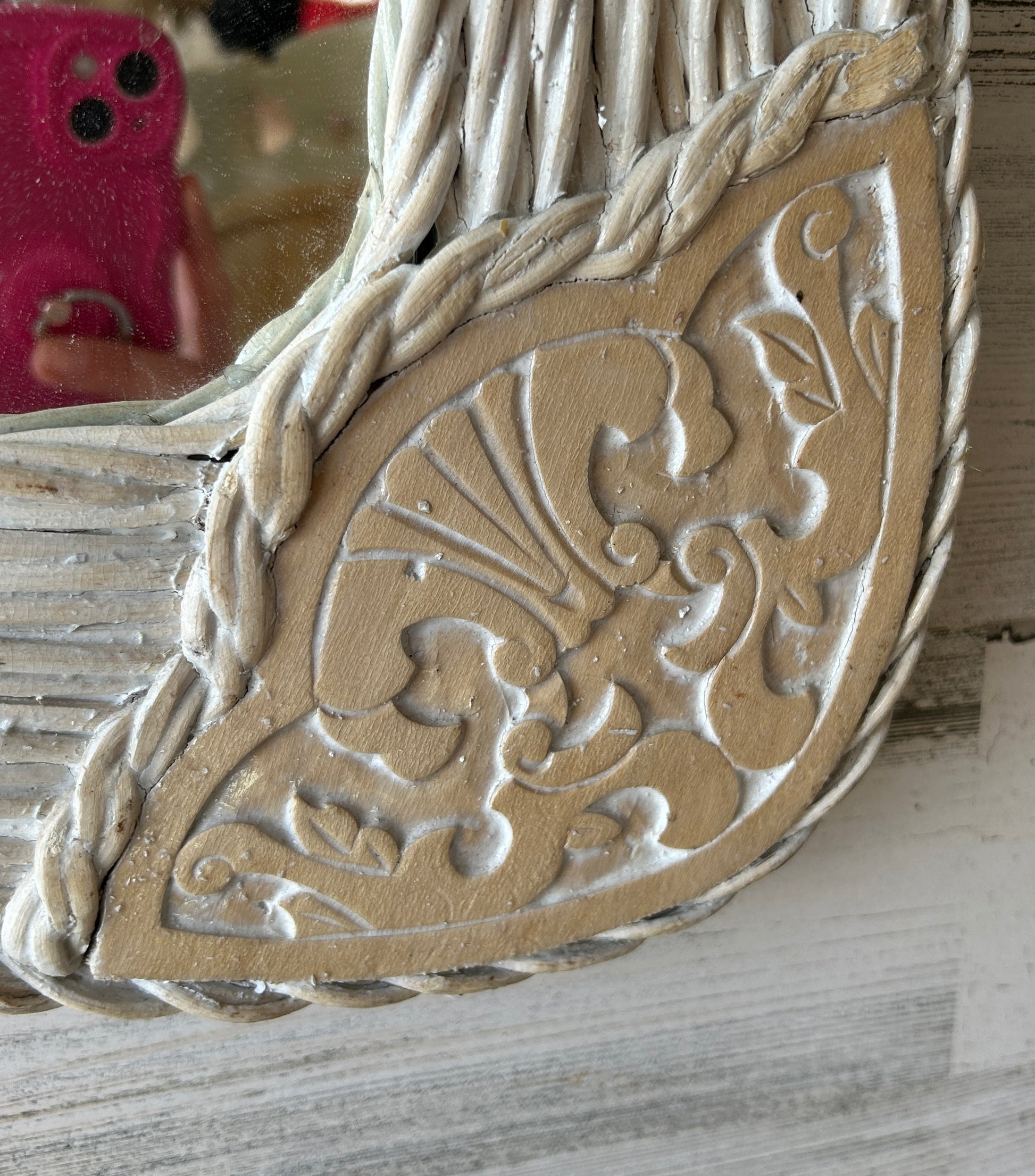 Vintage white-washed rattan mirror. Carved ornate wood corners. Minor wear from age. It can be hung both vertically or horizontally.