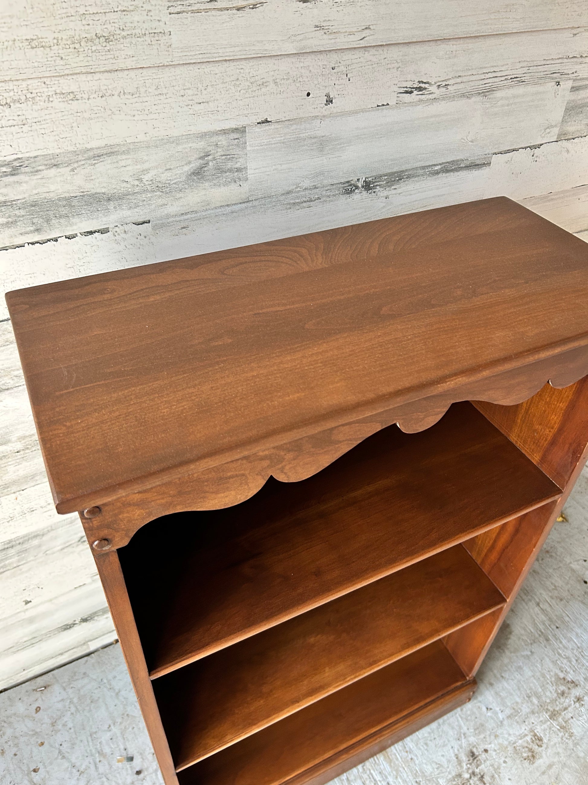 Vintage wood bookcase. Heavy wood with a scalloped design. Three shelves. The shelves are not adjustable. Minor wear from age.