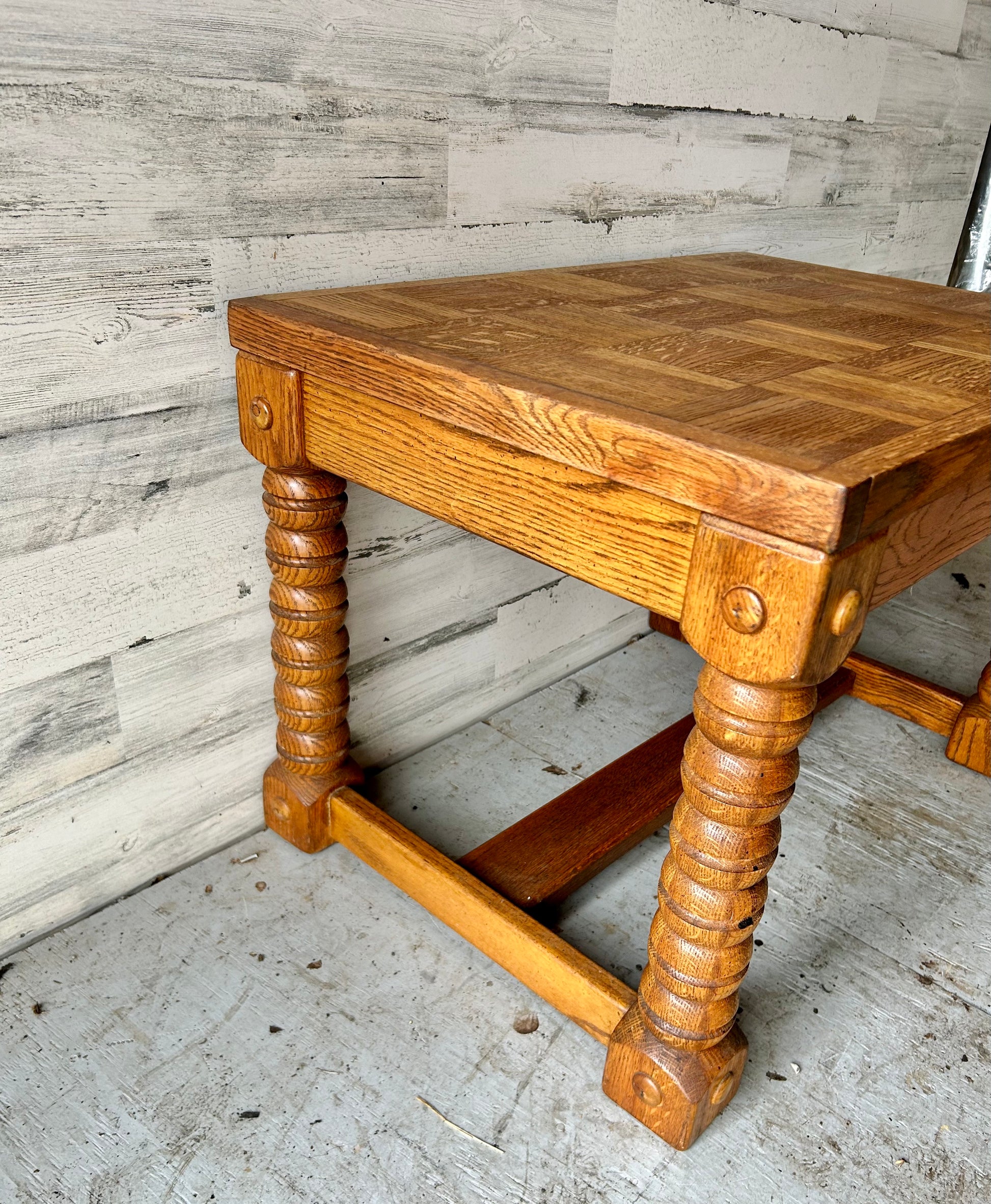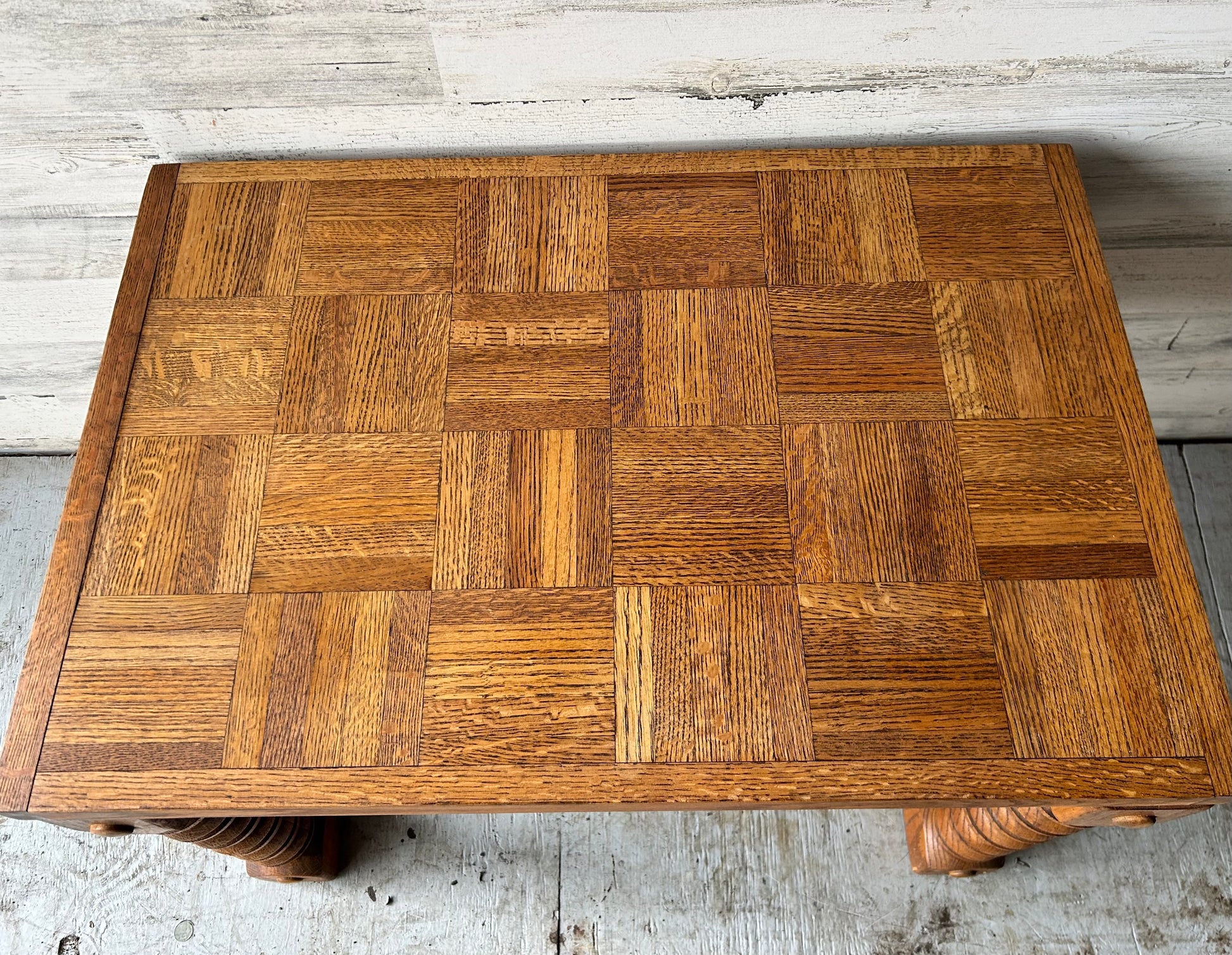 Vintage, solid wood (heavy) small coffee table. Could also be used as a wide table. Parquet design on top with turned wood legs.